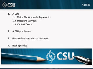 O documento apresenta a agenda do evento CSU Day 2012. A agenda inclui uma seção sobre a CSU, suas unidades de negócios de meios eletrônicos de pagamento, marketing services e contact center. Também inclui seções sobre a CSU por dentro, perspectivas para os mercados e slides adicionais.