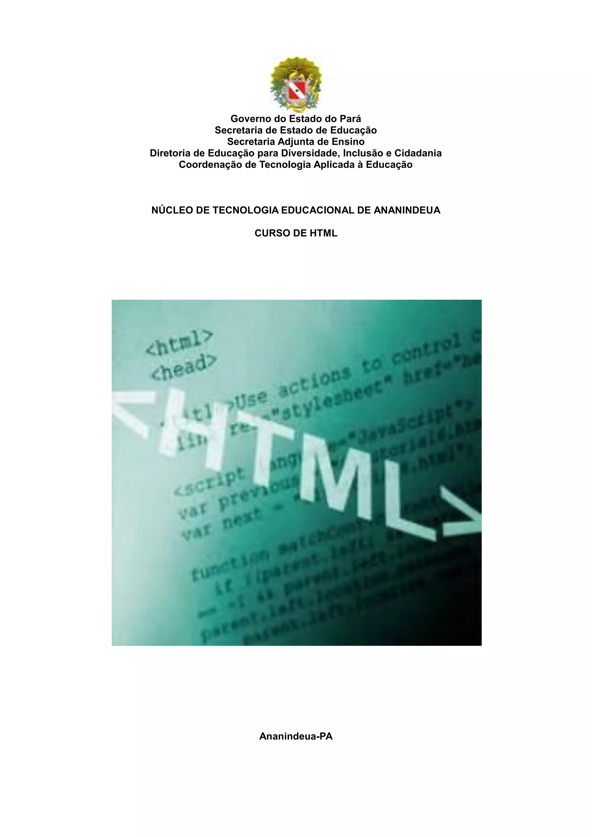 Este documento fornece informações sobre um curso de HTML ministrado para professores e funcionários da Secretaria de Educação do Estado do Pará no Brasil. O documento apresenta os objetivos do curso de ensinar os princípios básicos de HTML para criação de sites e blogs, e fornece um glossário de termos relacionados à Internet para os alunos.
