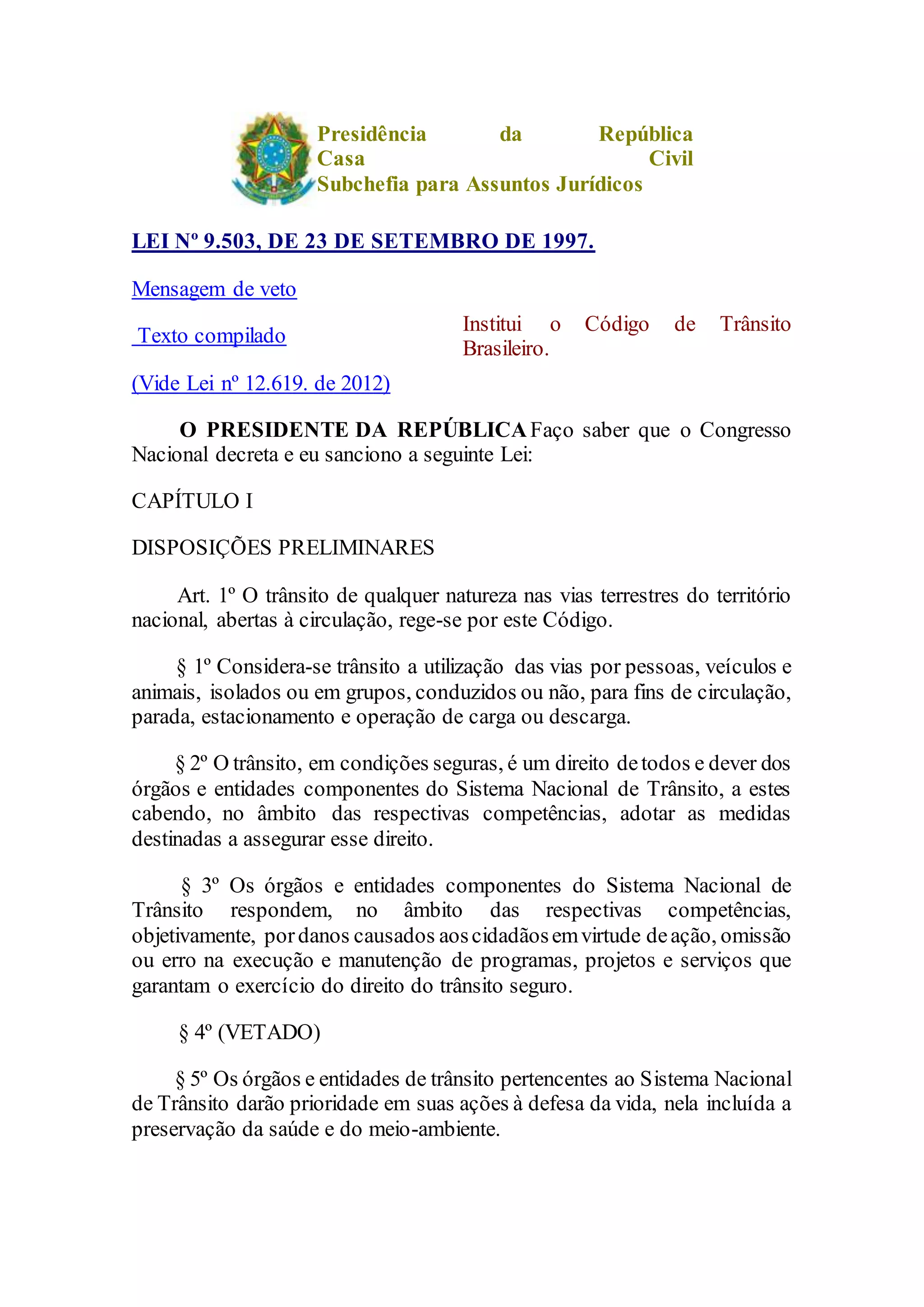 Este documento apresenta trechos do Código Brasileiro de Trânsito, definindo as leis e regulamentações sobre trânsito no Brasil. Ele estabelece o Sistema Nacional de Trânsito, composto por órgãos federais, estaduais e municipais, e define suas atribuições e competências, como estabelecer normas de trânsito, coordenar políticas, julgar recursos e fiscalizar o cumprimento das leis.