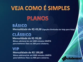 O documento descreve um plano de marketing e compensação para uma empresa de VOIP (transmissão de voz pela internet). O plano inclui bônus fixos de adesão e mensais, além de percentuais sobre as vendas dos membros recrutados (downlines). Há possibilidades de promoção a Diretor, Diretor Executivo e Presidente com ganhos adicionais sobre os bônus dos downlines recrutados.