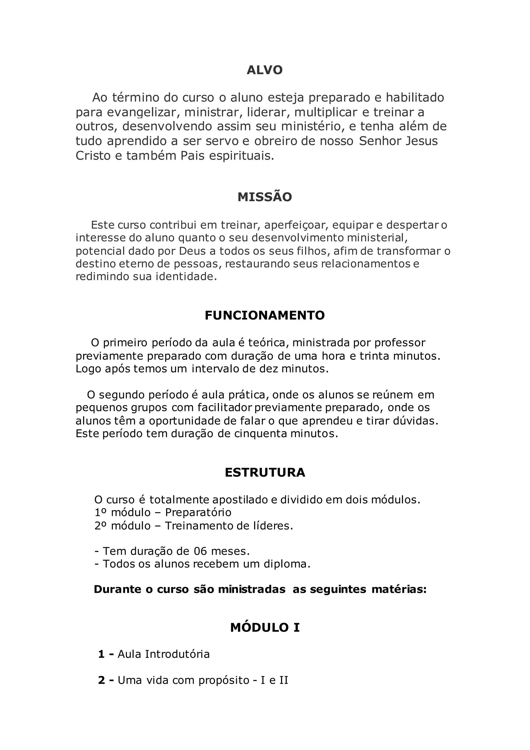 O curso tem como objetivo preparar os alunos para evangelizar, liderar e treinar outros. É dividido em dois módulos sobre preparação ministerial e treinamento de líderes, com duração de seis meses. As aulas combinam teoria e prática para capacitar os alunos espiritual e ministerialmente.
