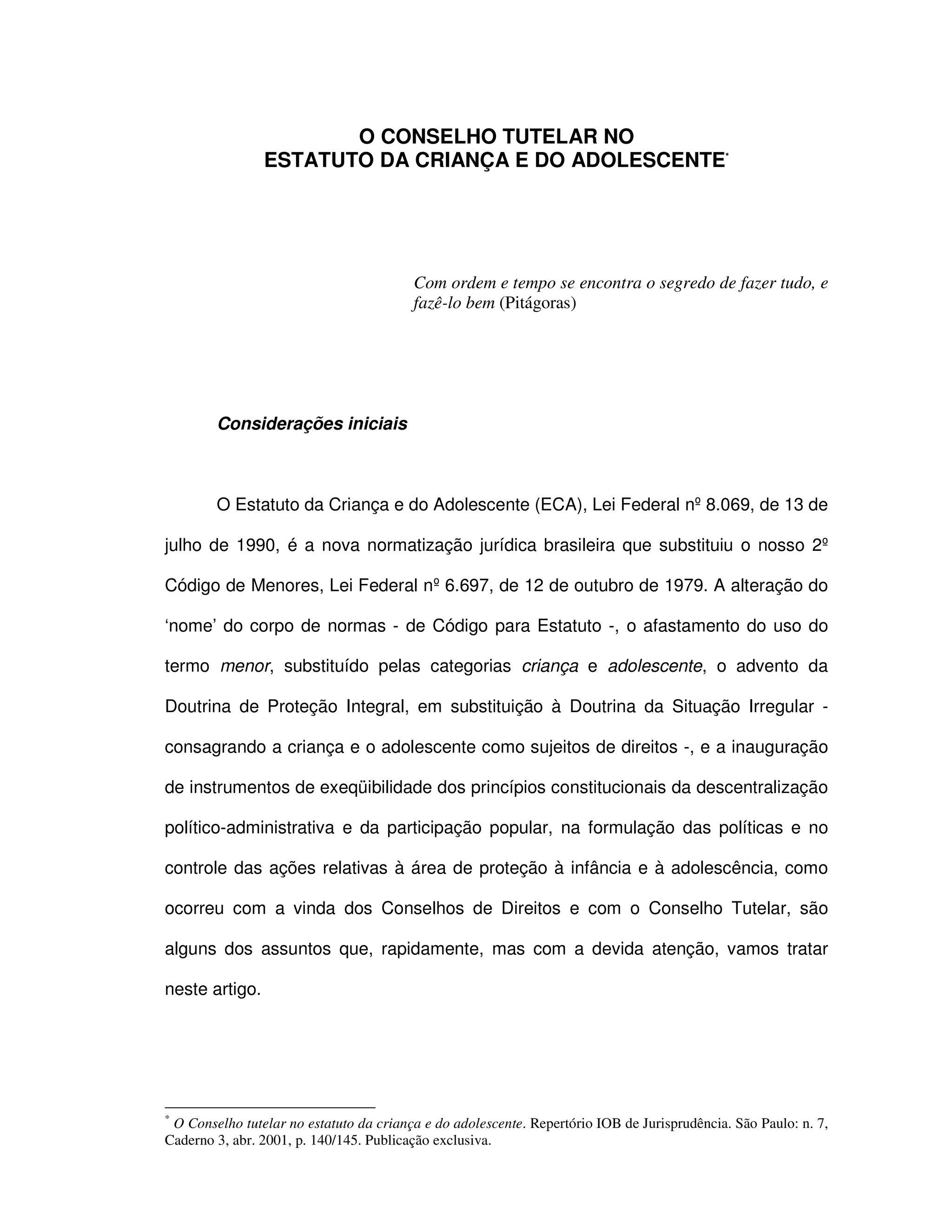 1) O documento discute o Conselho Tutelar no Estatuto da Criança e do Adolescente.