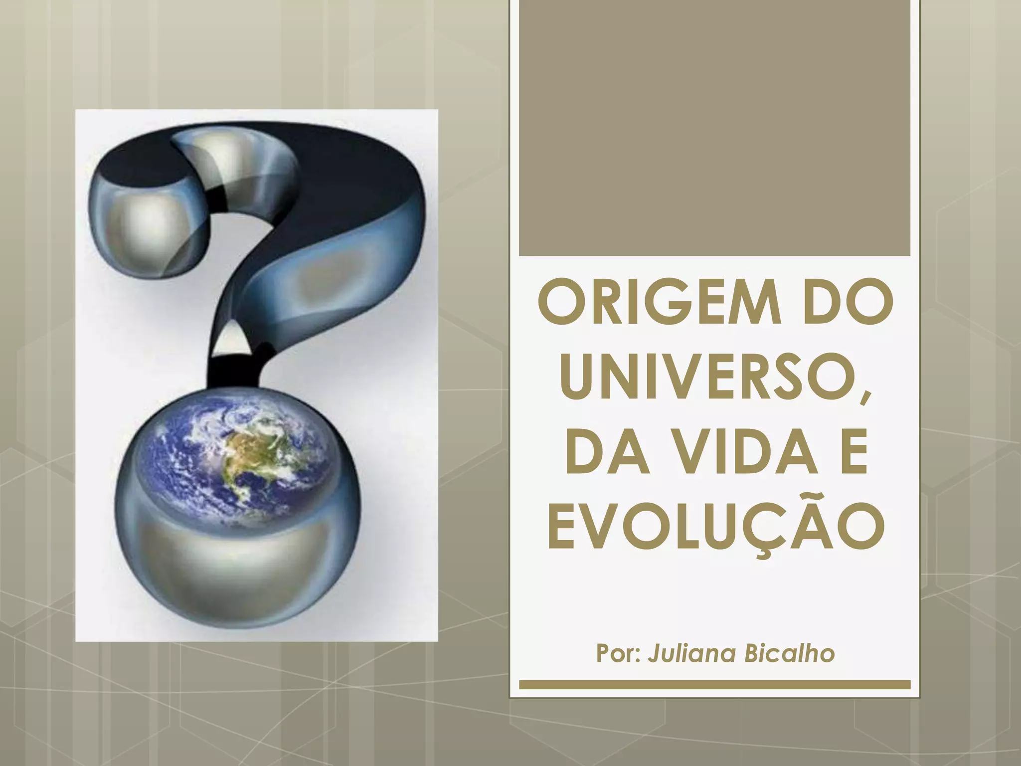 O documento discute as principais teorias sobre a origem do universo, da vida e da evolução. Apresenta as teorias de Nun, Atum, Tefnut, Geb, Nut, Hérebo, Nyx, Éter e Hémera sobre a origem do universo. Também aborda as teorias de van Helmont, Needham, Redi e Pasteur sobre a origem da vida, bem como o surgimento das primeiras formas de vida e a explosão de vida no Cambriano. Por fim, explica os principais tipos de fossilização: moldagem