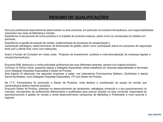 João Sobrinho tem experiência na indústria farmacêutica, tendo ocupado cargos de liderança em vendas e marketing. Possui um Mestrado em Marketing Farmacêutico e participou em diversos cursos de formação ao longo da carreira. Oferece competências em gestão de equipas, desenvolvimento de negócios, estratégia e projetos.