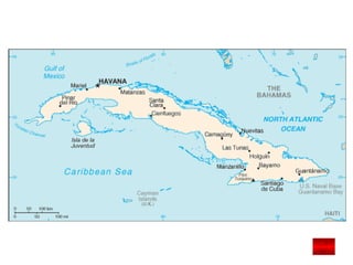 Cuba foi descoberta por Colombo em 1492 e dominada pela Espanha por 4 séculos. Em 1959, a Revolução Cubana liderada por Fidel Castro e Che Guevara derrubou o governo pró-EUA e estabeleceu um governo socialista. Cuba é hoje o único país socialista nas Américas e enfrenta desafios econômicos devido ao embargo dos EUA.