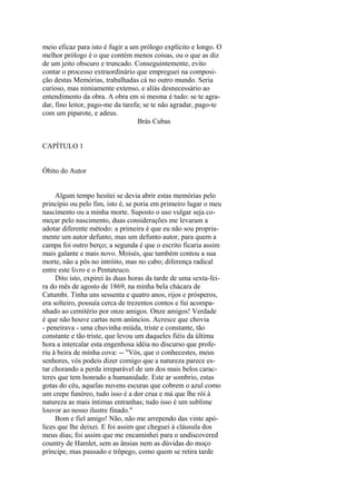 Este documento é um resumo do primeiro capítulo do livro "Memórias Póstumas de Brás Cubas", escrito por Machado de Assis. O capítulo descreve a morte do narrador Brás Cubas aos 64 anos de idade e sua jornada para o "país desconhecido" após sua morte, cercado por amigos e familiares em luto. O narrador fornece detalhes coloridos sobre sua morte e o funeral, incluindo o discurso emocionado de um amigo.