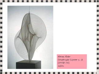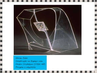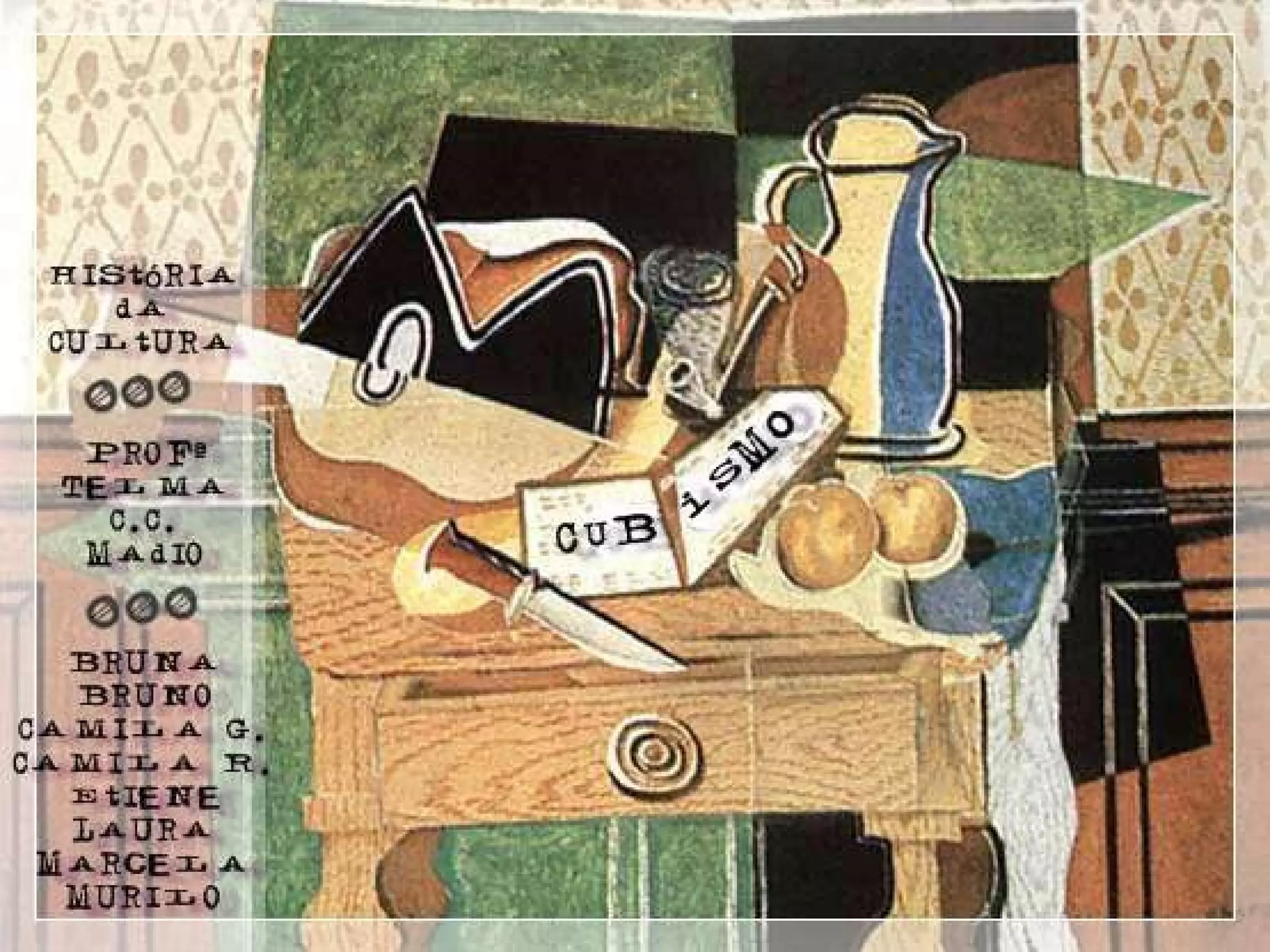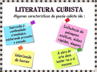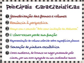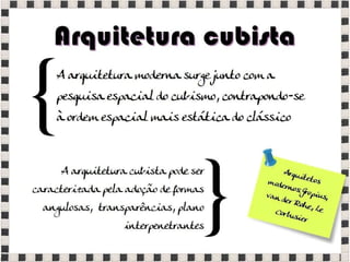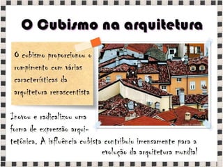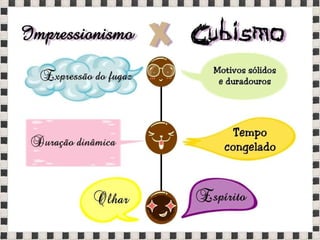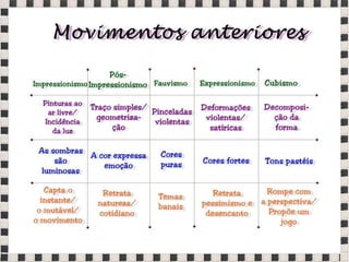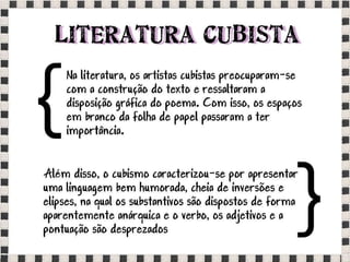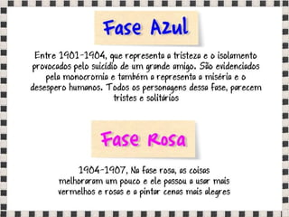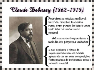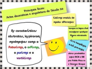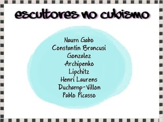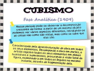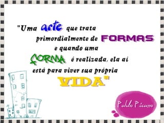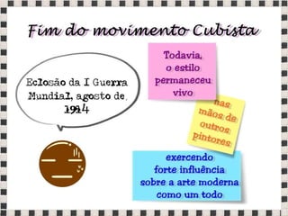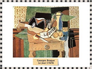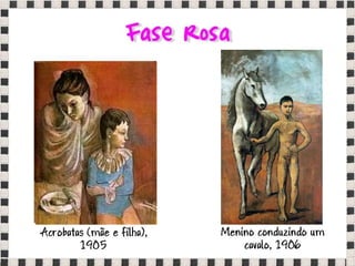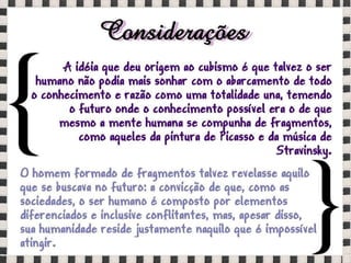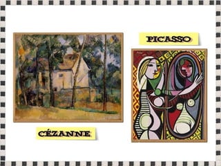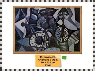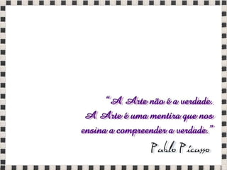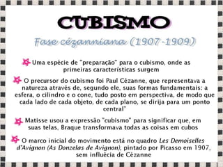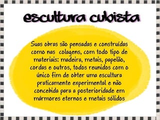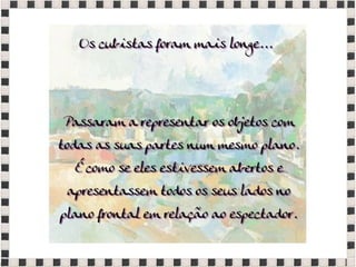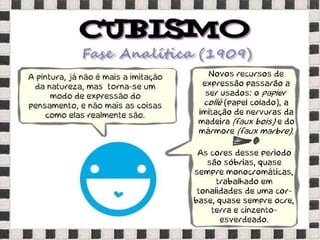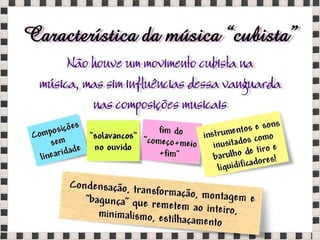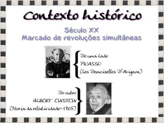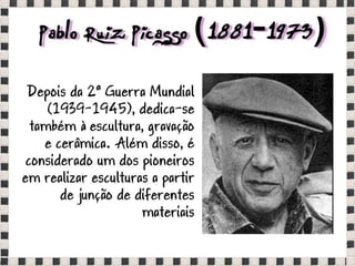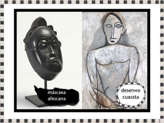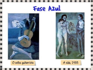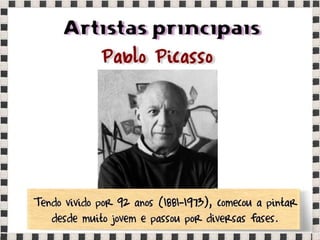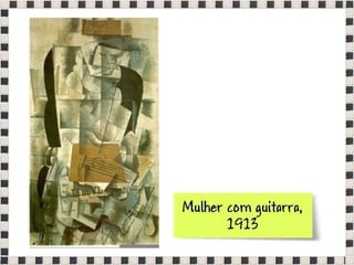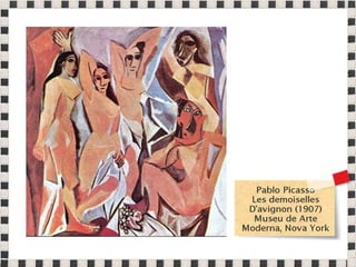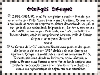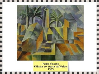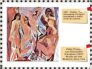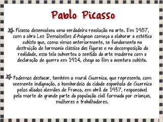 O documento fornece informações sobre obras do pintor Pablo Picasso, incluindo o famoso quadro Guernica, e da escultora Mulher no Jardim. Também menciona composições musicais de compositores como Stravinsky, Debussy e Villa-Lobos. Por fim, lista referências bibliográficas sobre o movimento artístico do Cubismo.