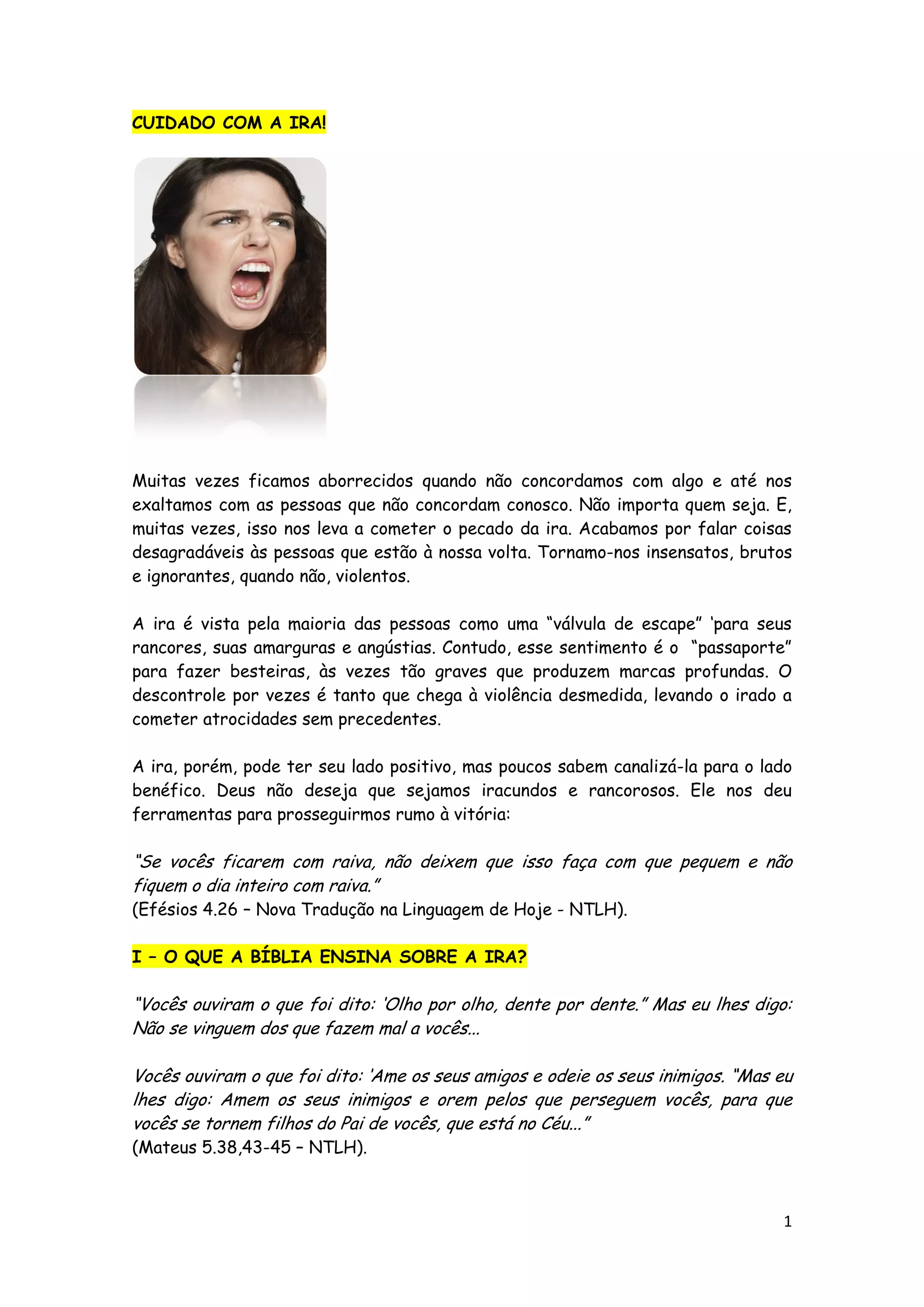 O documento discute os perigos da ira e como controlá-la, citando passagens bíblicas. A ira pode levar a violência e destruição se não for controlada, mas o amor e a paciência promovem a paz. A Bíblia ensina a não guardar rancor e a responder com delicadeza em vez de aumentar a raiva.
