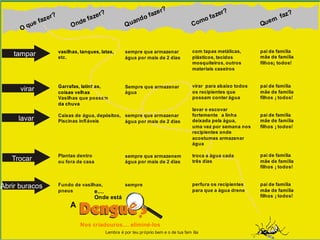 SE VOCÊ QUER SABER MAIS SOBRE A DENGUE E OUTRAS DOENÇAS QUE OS MOSQUITOS   TRANSMITEM, COMUNIQUE-SE COM O HOSPITAL OU POSTO DE SAÚDE DE SUA CIDADE, OU QUALQUER OUTRO CENTRO DE SAÚDE DO ESTADO  ELES PODEM ORIENTÁ-LO PARA PREVENIR TÃO TERRIVEL SITUAÇÃO OBRIGADO PELA SUA ATENÇÃO RICARDO ZEA SALAS GARCIA CAROLINA GRACIA CASTELLANOS CULTURA DEL AGUA COATZACOALCOS VER. MEXICO 2007