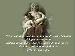 O documento é um relato sobre a importância das amizades para as mulheres. A autora lembra do conselho da mãe de nunca esquecer das amigas, mesmo depois de casada. Ao longo dos anos, ela compreendeu que as amigas oferecem apoio emocional e prático nos melhores e piores momentos da vida.