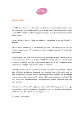 O documento apresenta um livro de receitas desenvolvido para ajudar mulheres a lidar com os sintomas da TPM. A chef Rita Lobo fornece 60 receitas baseadas em critérios nutricionais anti-TPM, explica os quatro tipos de TPM e indica a dieta adequada para cada um. A marca Intimus patrocina o projeto com o objetivo de promover o bem-estar feminino.