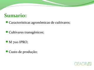 O documento aborda as características agronômicas e de produção de cultivares de soja, incluindo aspectos como grupos de maturidade, resistência a doenças, e tipos de crescimento. Também discute a evolução e os impactos das cultivares transgênicas no custo de produção. Por fim, fornece informações específicas sobre diversas variedades e suas características agronômicas.