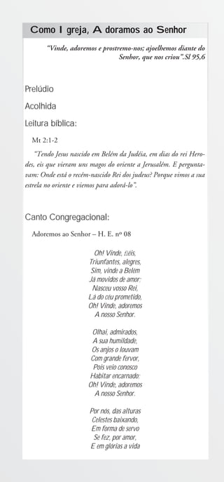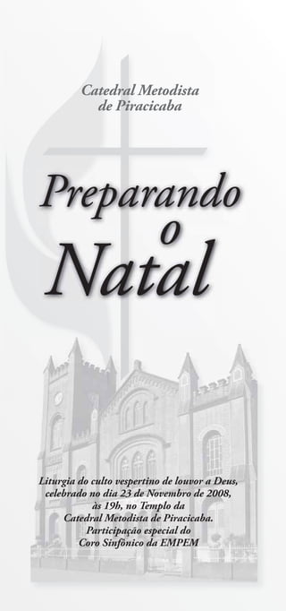 O documento descreve um culto de Natal realizado na Catedral Metodista de Piracicaba em 23 de novembro de 2008, incluindo leituras bíblicas, cânticos, reflexão pastoral e participação especial do Coro Sinfônico da Escola de Música de Piracicaba. O culto celebrou o nascimento de Jesus através da adoração, confissão, louvor e escuta da palavra de Deus.