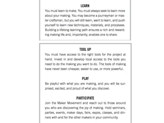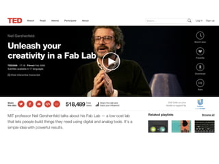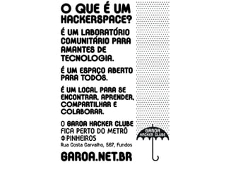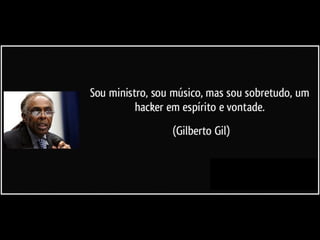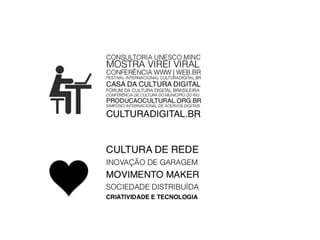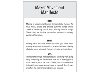 O documento discute a cultura maker e como ela está repensando cultura, direito e tecnologia através da apropriação colaborativa e compartilhamento de conhecimento e tecnologias em espaços como makerspaces e fablabs.