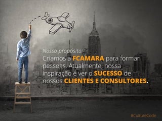 Este documento descreve a cultura da empresa FCamara, enfatizando que eles formam pessoas ao invés de apenas técnicos, possuem competência interdisciplinar, estão sempre prontos para novos desafios, constroem relações de sucesso com clientes, e que os funcionários são protagonistas de suas próprias histórias. A cultura da empresa é baseada em valores como formação contínua, trabalho em equipe, foco no cliente, e assumir desafios.