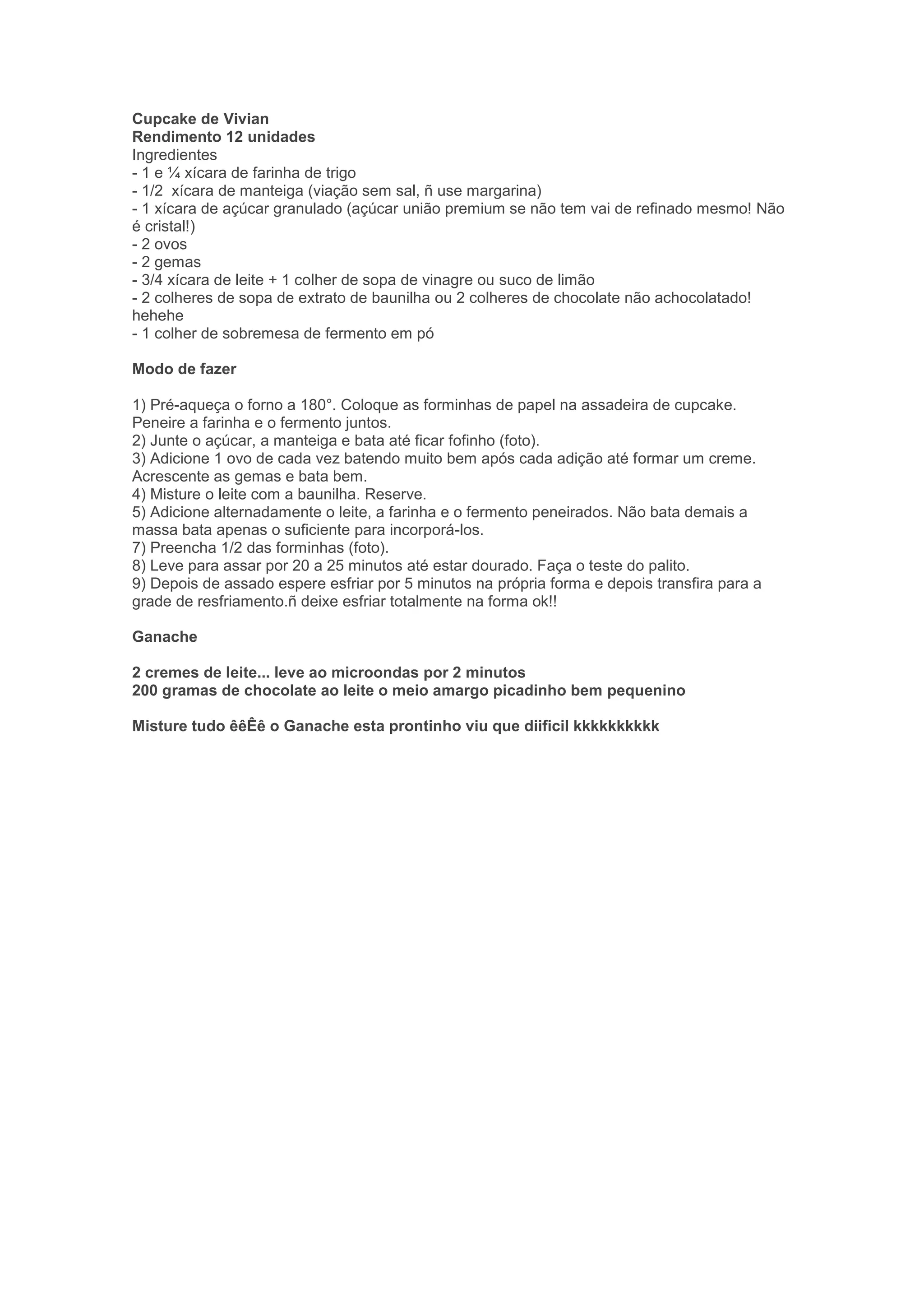 Esta receita fornece instruções para fazer cupcakes de baunilha ou chocolate com ganache. Ela lista os ingredientes necessários como farinha, açúcar, ovos e leite e fornece etapas detalhadas como bater os ingredientes, alternar a adição de líquidos e farinha e assar por 20-25 minutos. A receita também fornece instruções simples para fazer uma cobertura de ganache derretendo chocolate em creme de leite aquecido no microondas.
