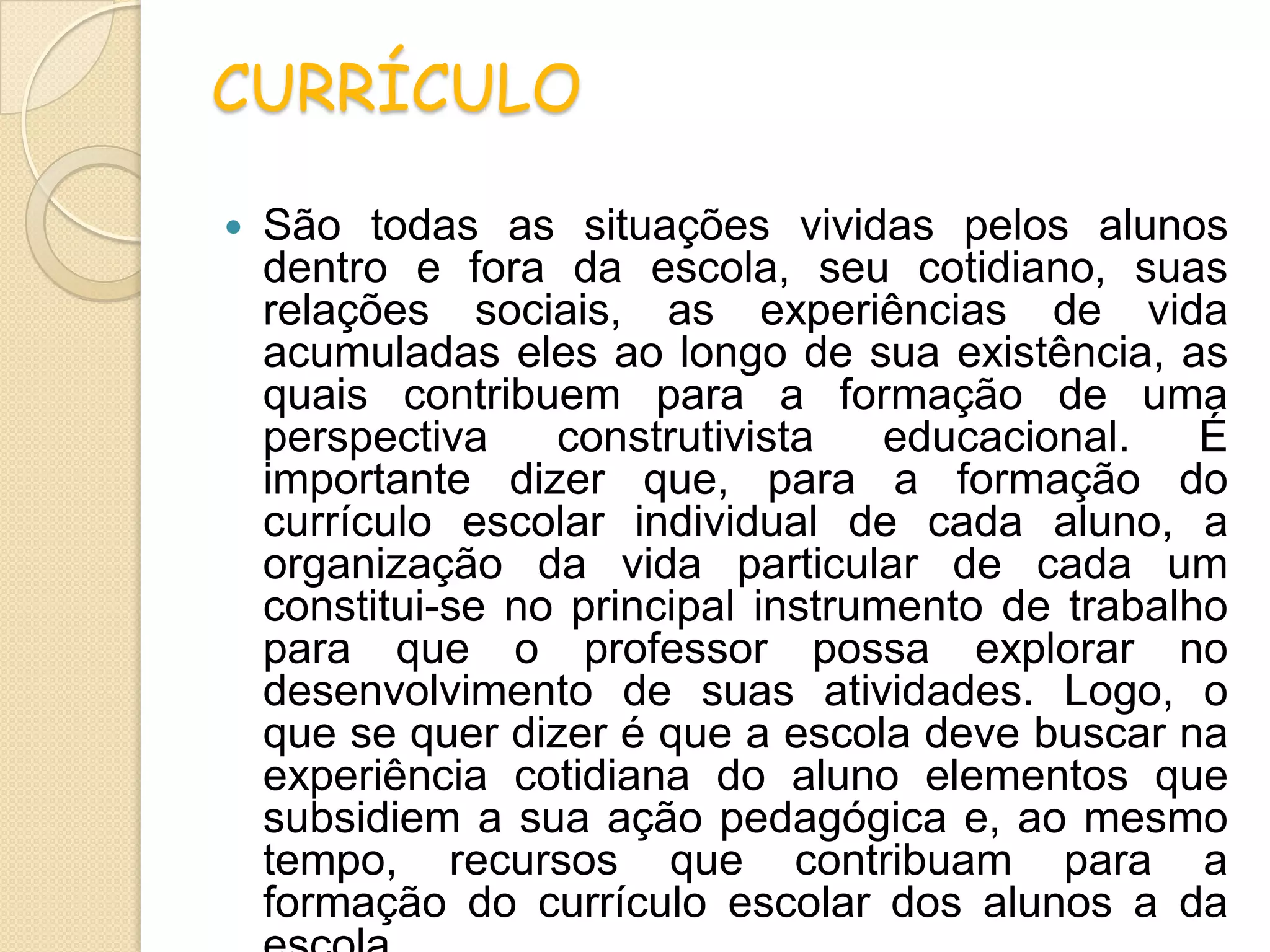 O documento discute o currículo escolar como as experiências vividas pelos alunos dentro e fora da escola que contribuem para sua formação, e a importância de o professor explorar a vida particular de cada aluno para desenvolver atividades pedagógicas. Também apresenta o currículo como um processo de socialização das crianças e a necessidade de integrar a vida escolar e social por meio das relações e experiências dos alunos.