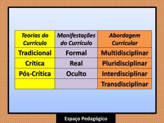 O documento discute diferentes teorias do currículo, incluindo: 1) a abordagem tradicional associada a Bobbitt e Taylorismo, focada em objetivos, eficiência e reprodução; 2) a abordagem crítica influenciada por Marx e Freire, defendendo transformação social; 3) a abordagem pós-crítica considerando novos temas como gênero e raça.