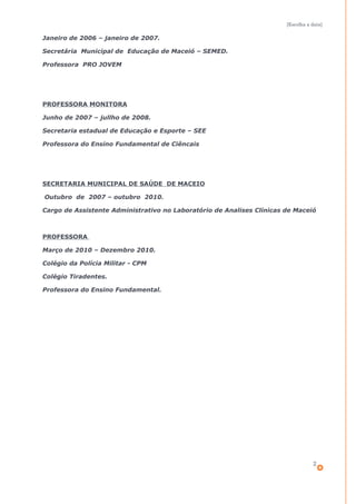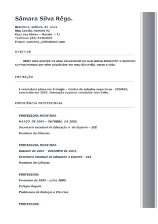 Este currículo resume a experiência profissional e formação acadêmica de Sâmara Silva Rêgo, uma brasileira de 31 anos formada em Biologia que busca uma posição como professora para transmitir conhecimentos adquiridos. Seu currículo destaca experiências como professora de Biologia, Ciências e no Ensino Fundamental, além de ter trabalhado como assistente administrativo em um laboratório de análises clínicas.