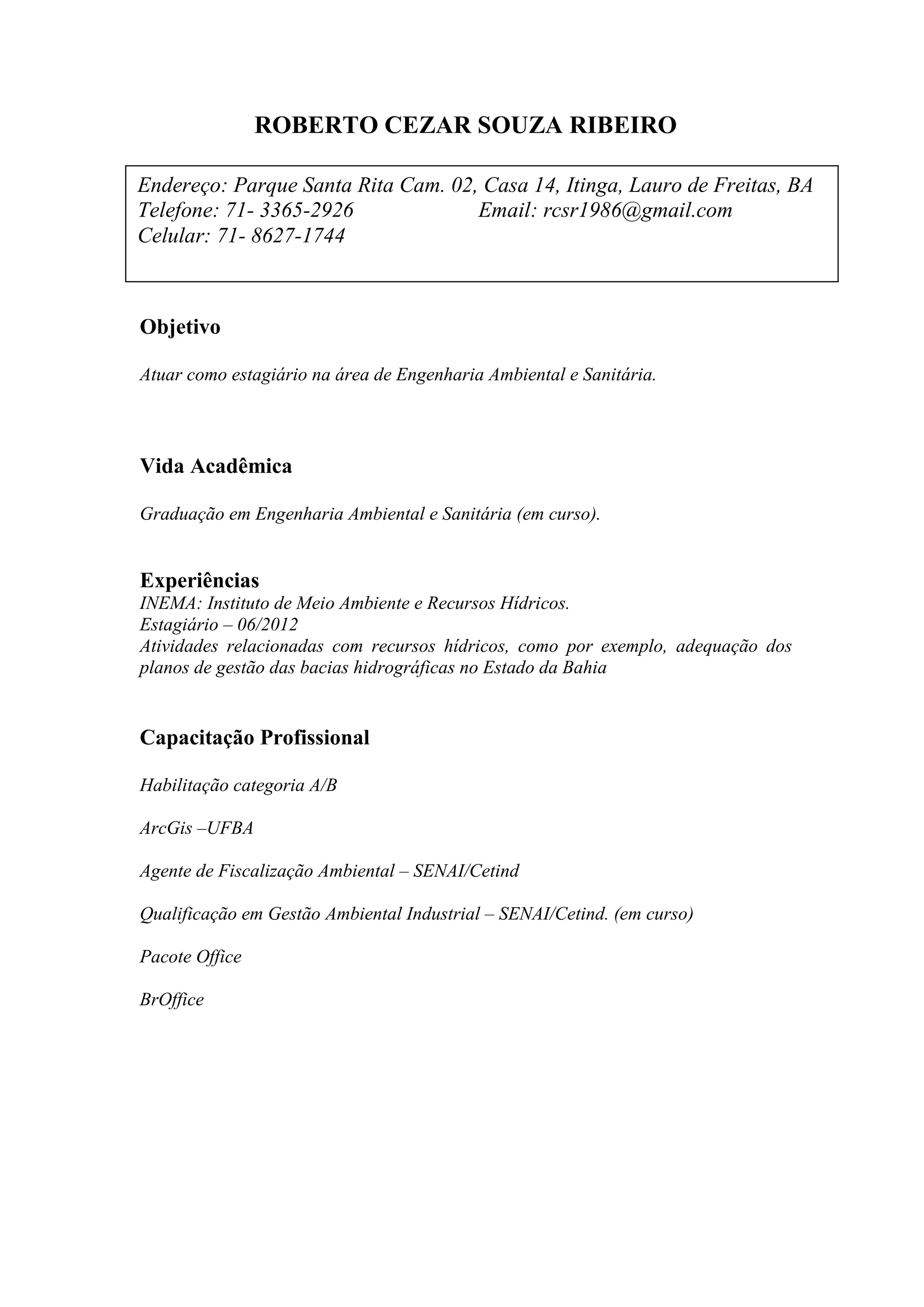 Este documento apresenta o currículo de Roberto Cezar Souza Ribeiro, estudante de Engenharia Ambiental e Sanitária. Ele fornece seus contatos, objetivo de estagiar na área, experiência como estagiário do INEMA e capacitações profissionais em ArcGIS, fiscalização ambiental e pacote Office.