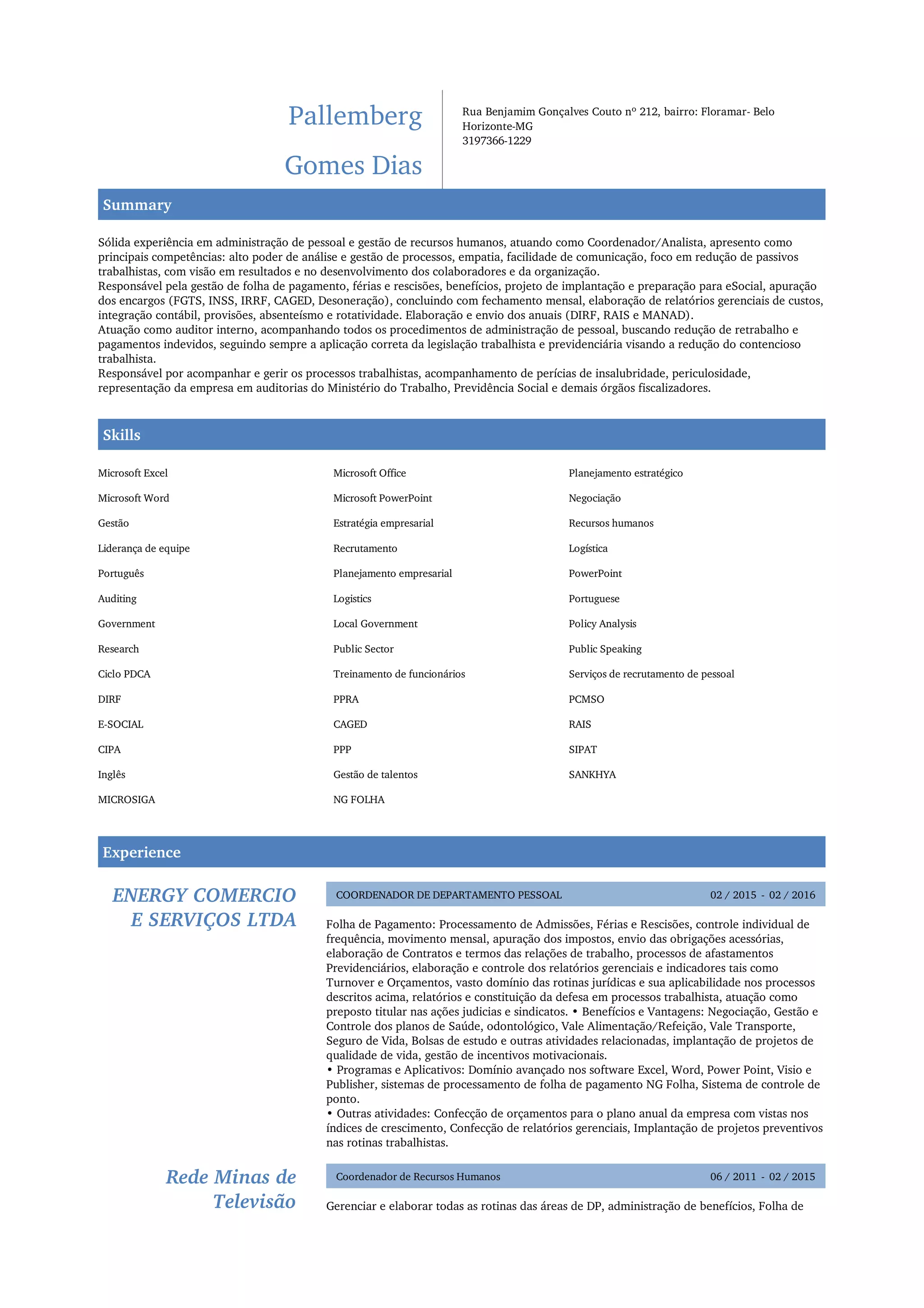 Sólida experiência em administração de pessoal e gestão de recursos humanos, atuando como Coordenador/Analista, apresento como