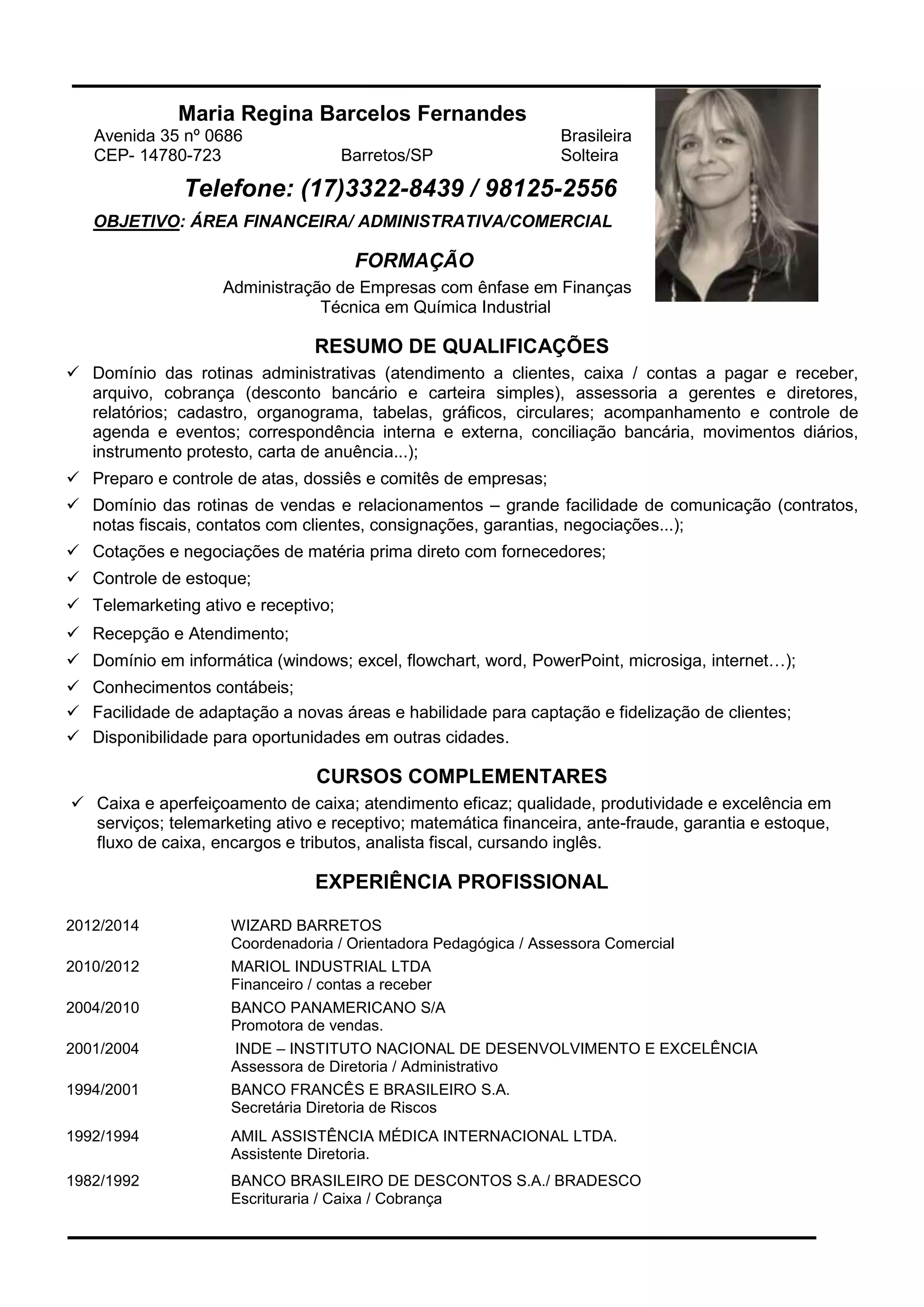 Maria Regina possui formação em Administração de Empresas e Química Industrial e experiência em áreas financeira, administrativa e comercial. Ela tem domínio de rotinas administrativas e de vendas, além de habilidades em informática e conhecimentos contábeis. Sua experiência profissional inclui cargos em bancos, indústrias e instituições de saúde.