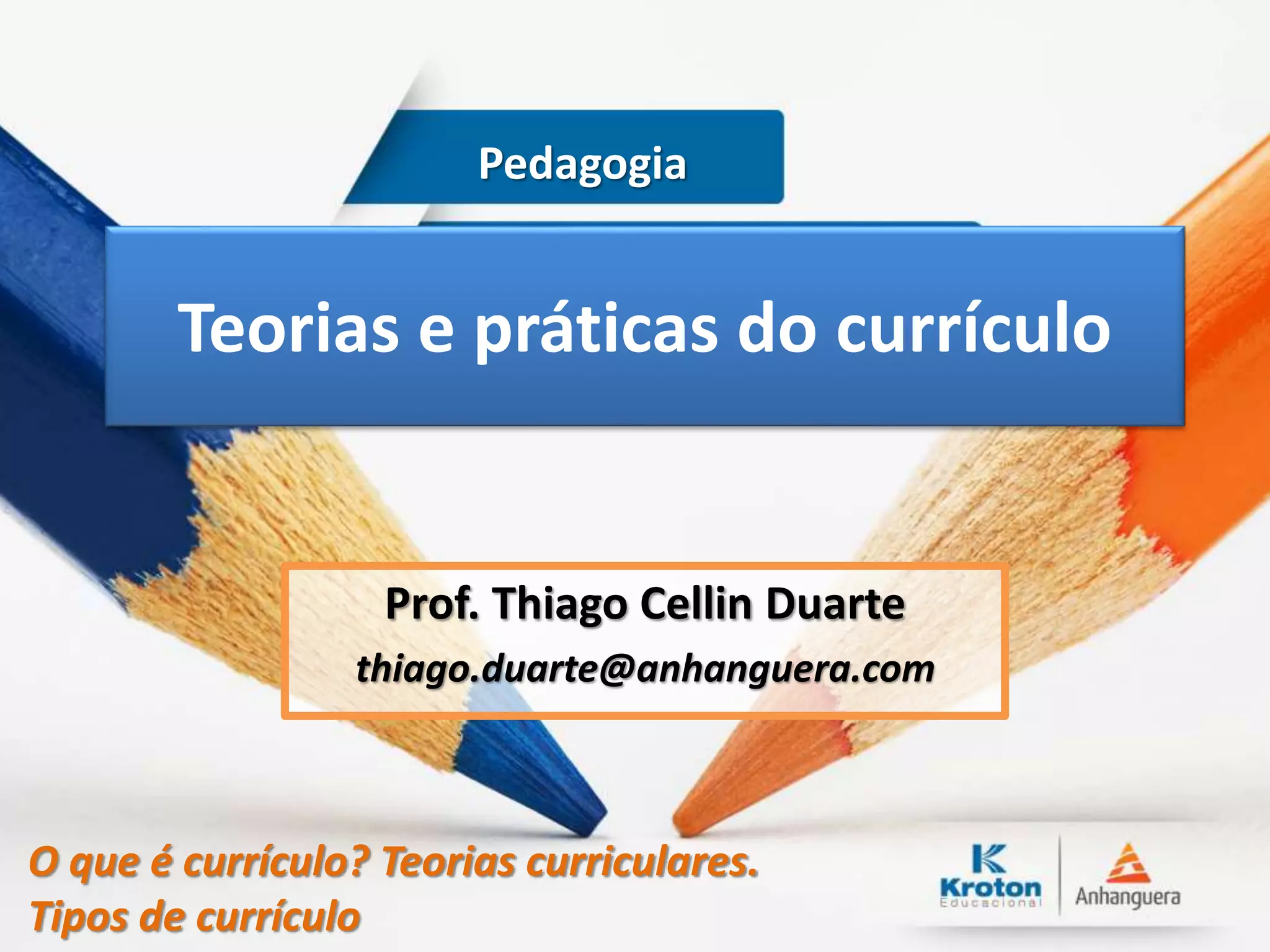 Este documento discute o conceito de currículo, teorias curriculares e tipos de currículo. Define currículo como a organização do conhecimento escolar e discute que envolve questões de poder e relações sociais. Apresenta teorias tradicionais, críticas e pós-críticas do currículo. Finalmente, lista tipos de currículo sem detalhá-los.