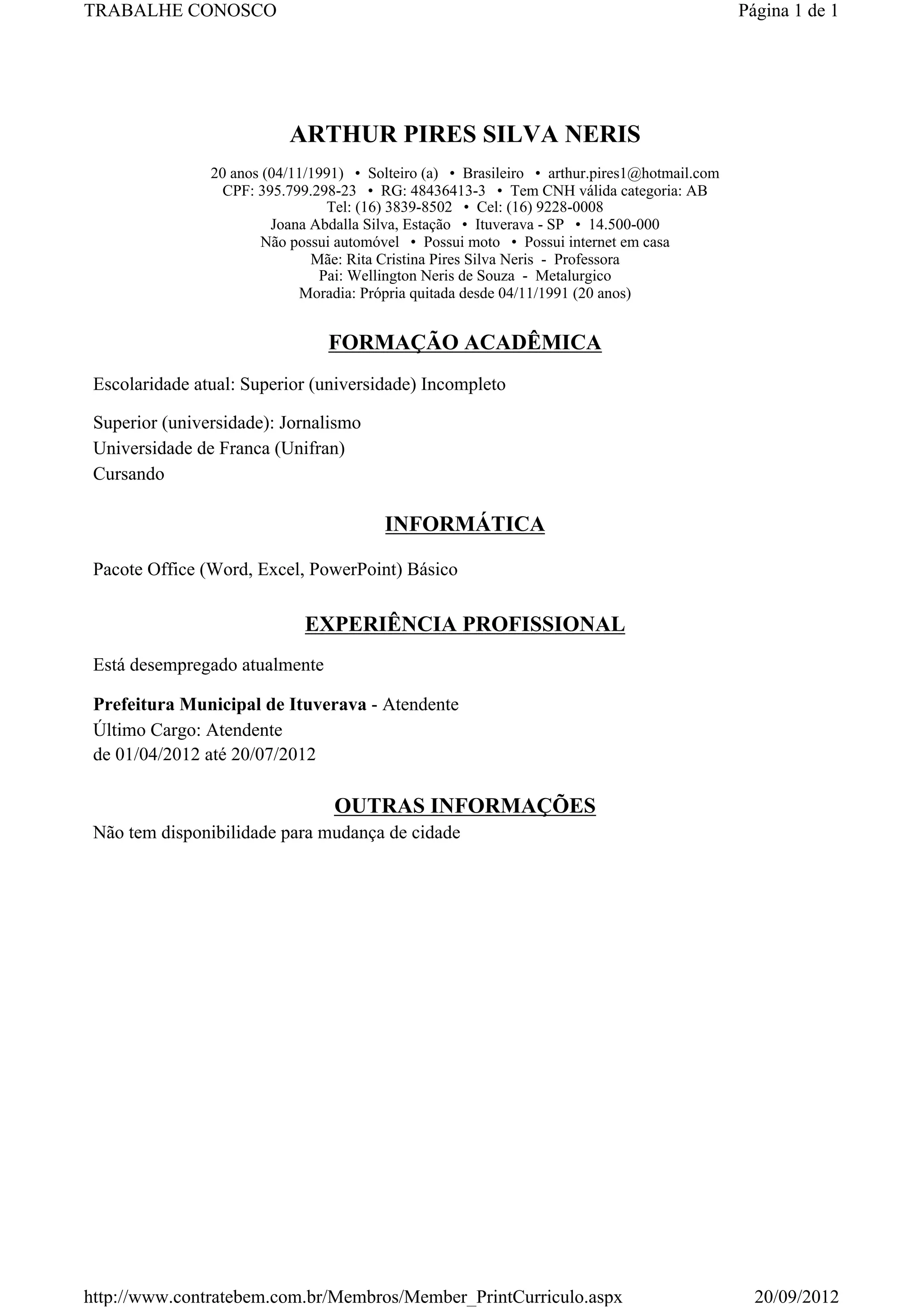 Arthur Pires Silva Neris é um jovem de 20 anos que está cursando Jornalismo na Universidade de Franca. Ele possui experiência de apenas 3 meses como atendente na Prefeitura Municipal de Ituverava e atualmente está desempregado e disponível para novas oportunidades.