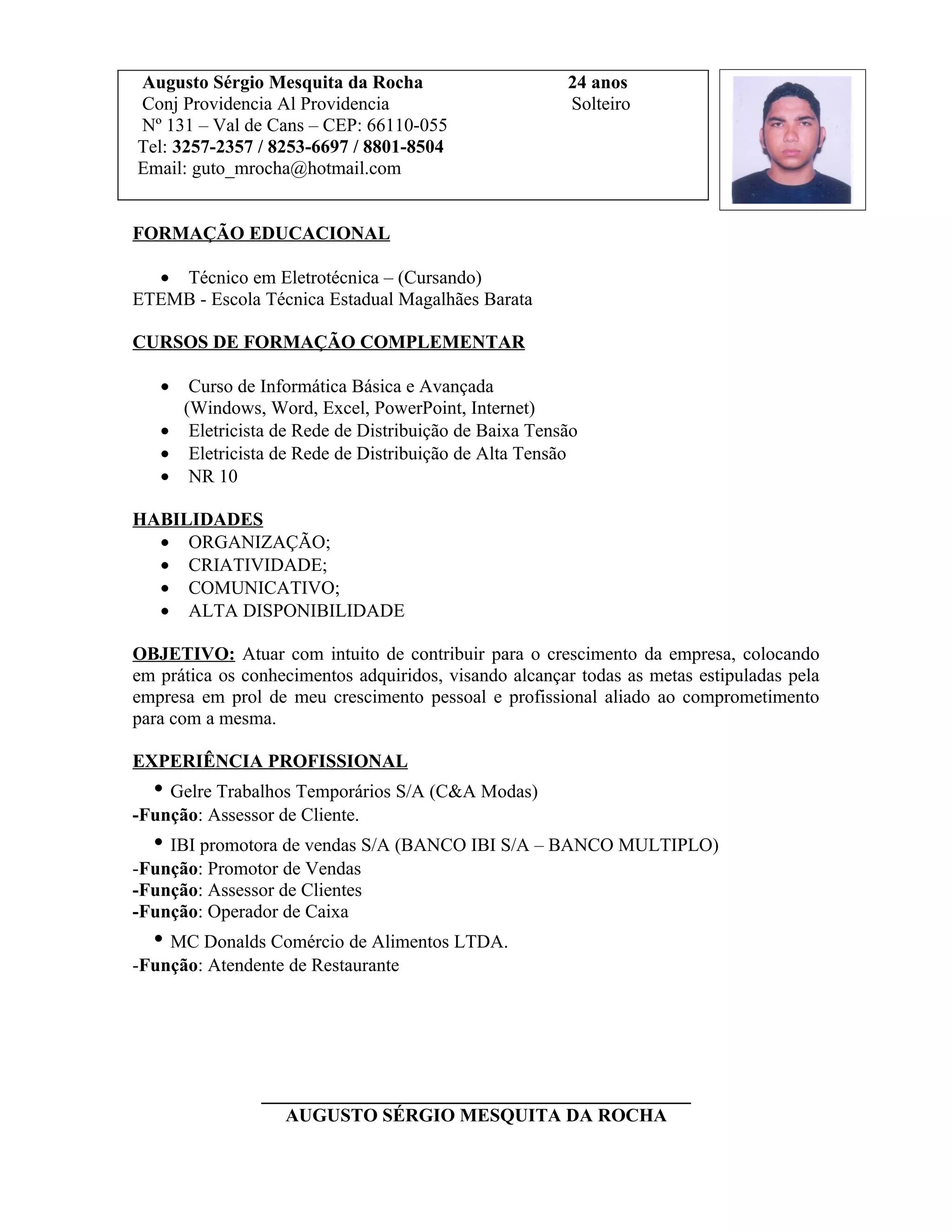 Augusto Sérgio Mesquita da Rocha é um técnico em eletrotécnica de 24 anos que busca uma posição para aplicar seus conhecimentos e habilidades em organização, criatividade e comunicação para o crescimento da empresa e seu próprio desenvolvimento profissional. Sua experiência inclui assessor de clientes, promotor de vendas e atendente de restaurante.