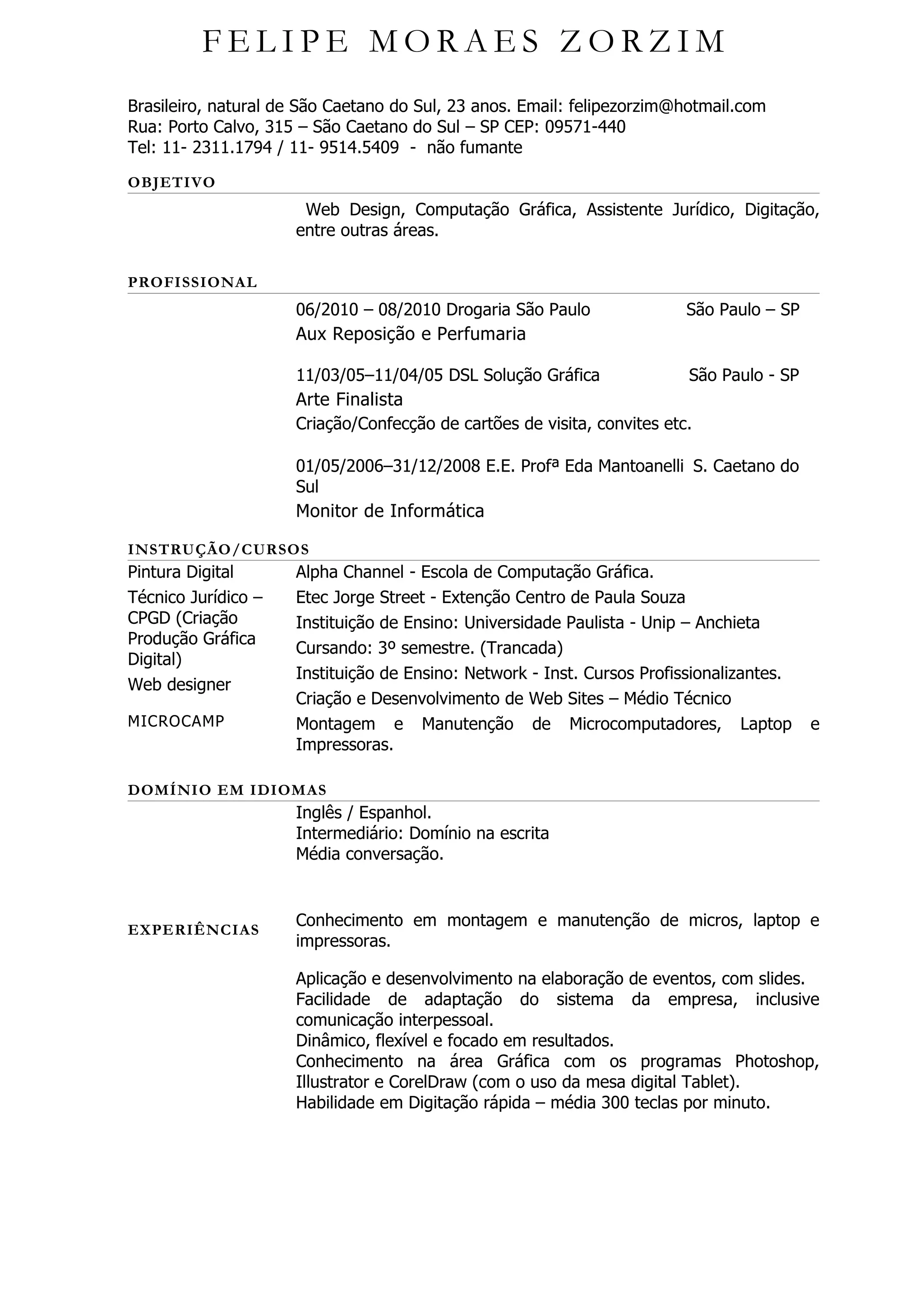 Felipe Moraes Zorzim, 23 anos, de São Caetano do Sul, busca uma vaga em web design, computação gráfica ou assistente jurídico. Tem experiência em reposição de drogaria, arte finalista e monitoria de informática. Estudou pintura digital, técnico jurídico e cursou CPGD e web design. Domina inglês e espanhol intermediariamente e tem habilidades em montagem de computadores e programas gráficos.