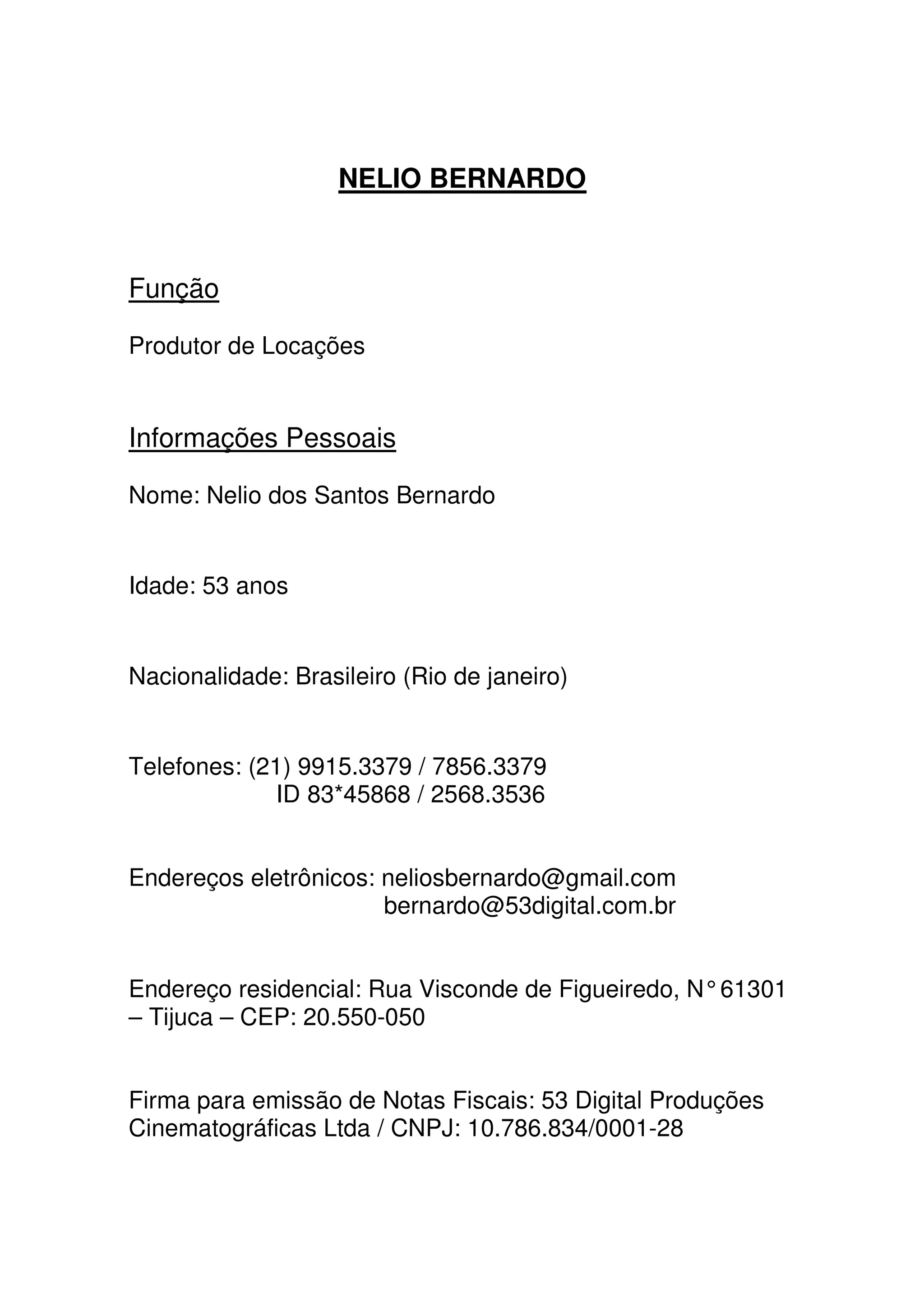 Nelio Bernardo é um produtor de locações com mais de 30 anos de experiência. Ele fornece locações para filmes, comerciais de TV, documentários e vídeos. Recentemente, ele produziu locações para dois filmes internacionais - um sobre a história da FIFA e outro chamado "Trash".