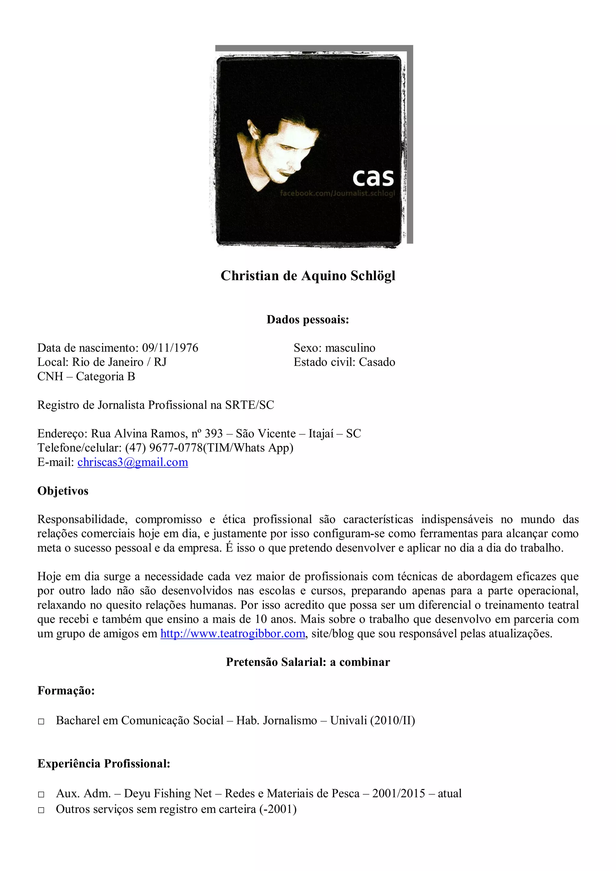 Este documento resume os dados pessoais e profissionais de Christian de Aquino Schlögl. Ele inclui informações como data de nascimento, estado civil, formação acadêmica em comunicação social e experiência como auxiliar administrativo. Também lista suas habilidades em informática, idiomas e áreas de interesse profissional como atendimento ao público e comunicação institucional.