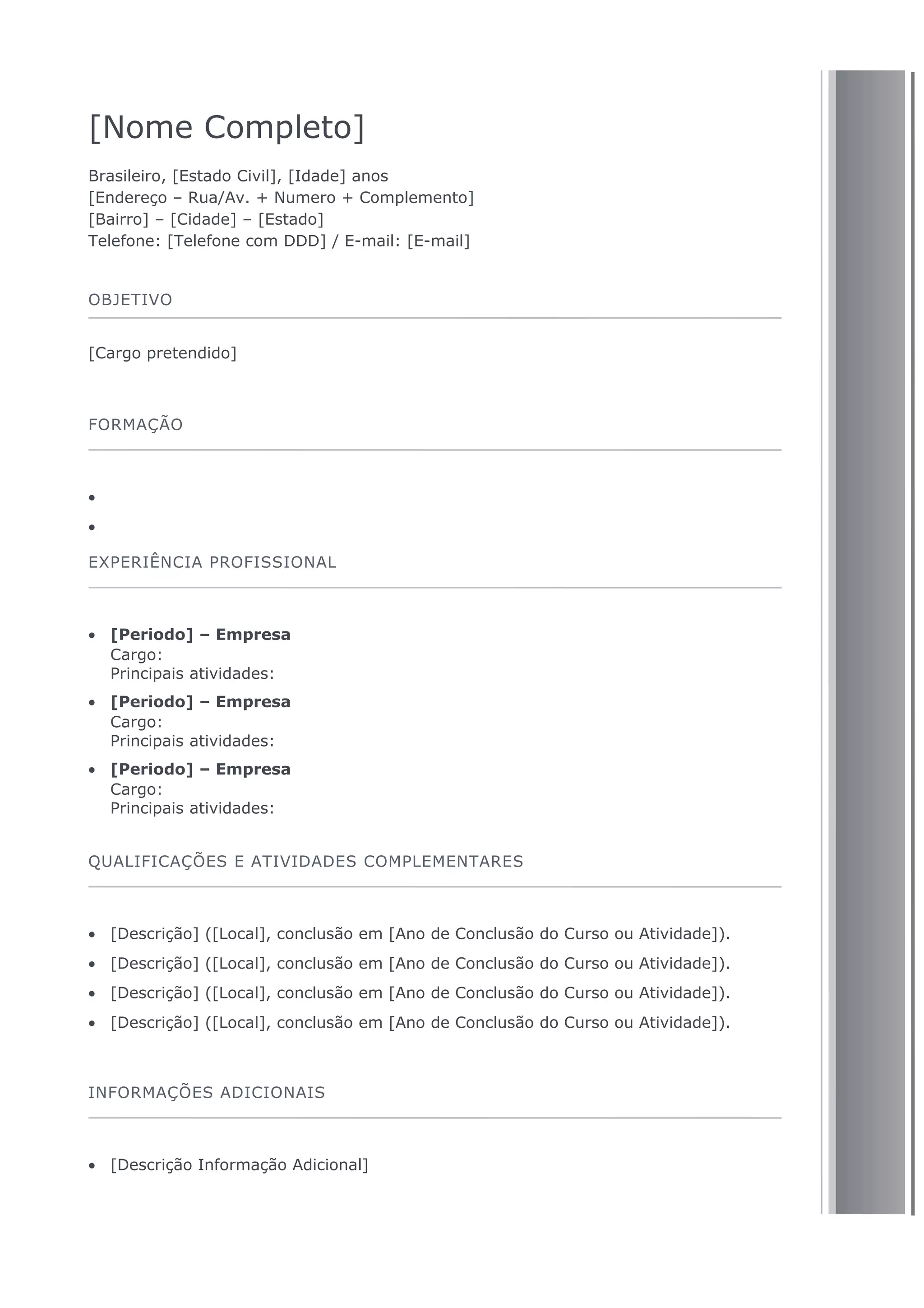 Este currículo apresenta os dados pessoais e profissionais de um indivíduo, incluindo nome, idade, endereço, telefone, objetivo de trabalho, formação acadêmica, experiência profissional, qualificações e atividades complementares realizadas, e informações adicionais.