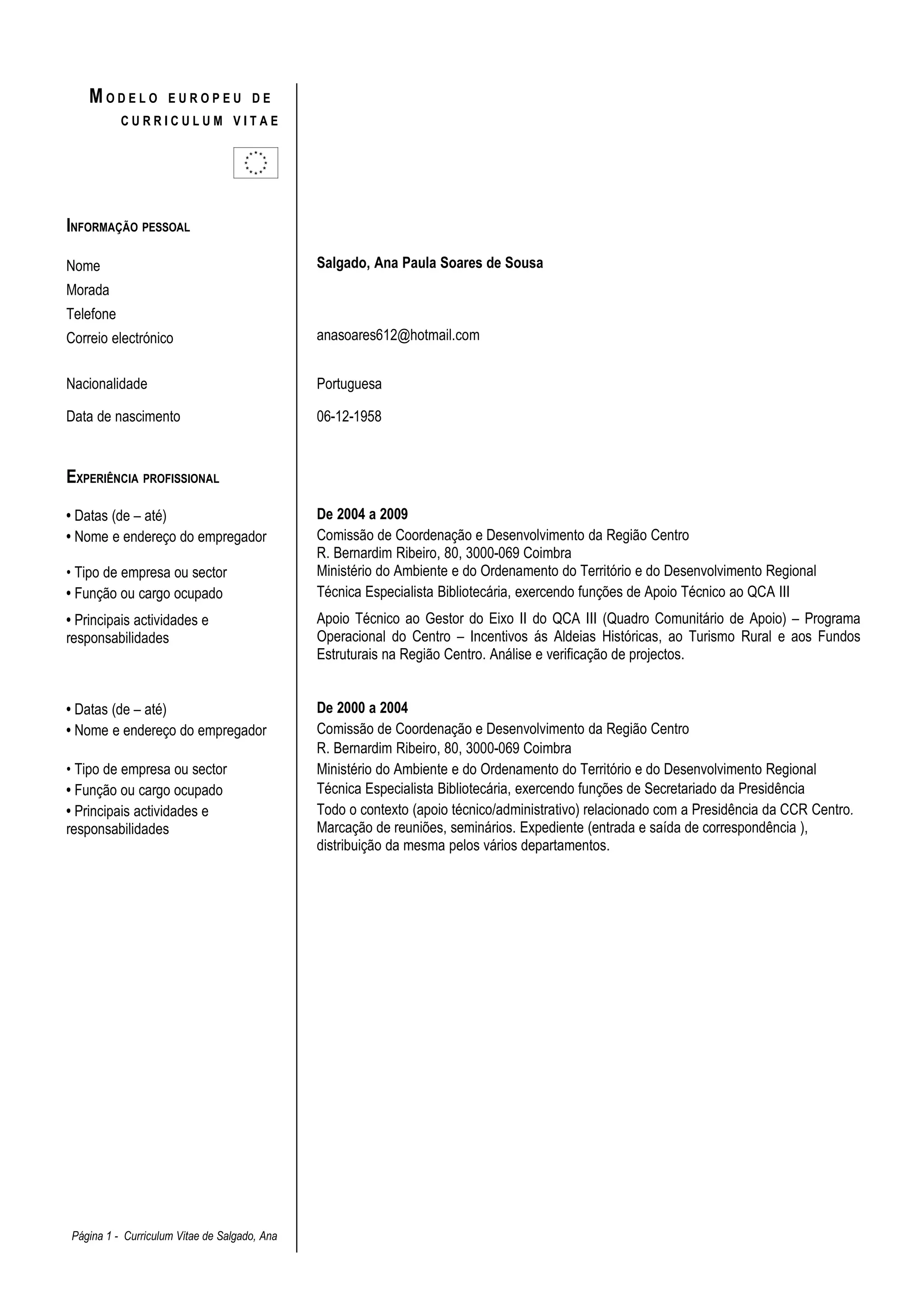 Este currículo vitae detalha a experiência profissional e formação acadêmica de Ana Paula Salgado. Ela trabalhou por mais de 30 anos para a Comissão de Coordenação e Desenvolvimento da Região Centro em várias funções administrativas e de secretariado. Salgado também frequentou cursos de comunicação empresarial, bibliotecas e documentação, e participou de várias ações de formação ao longo de sua carreira.