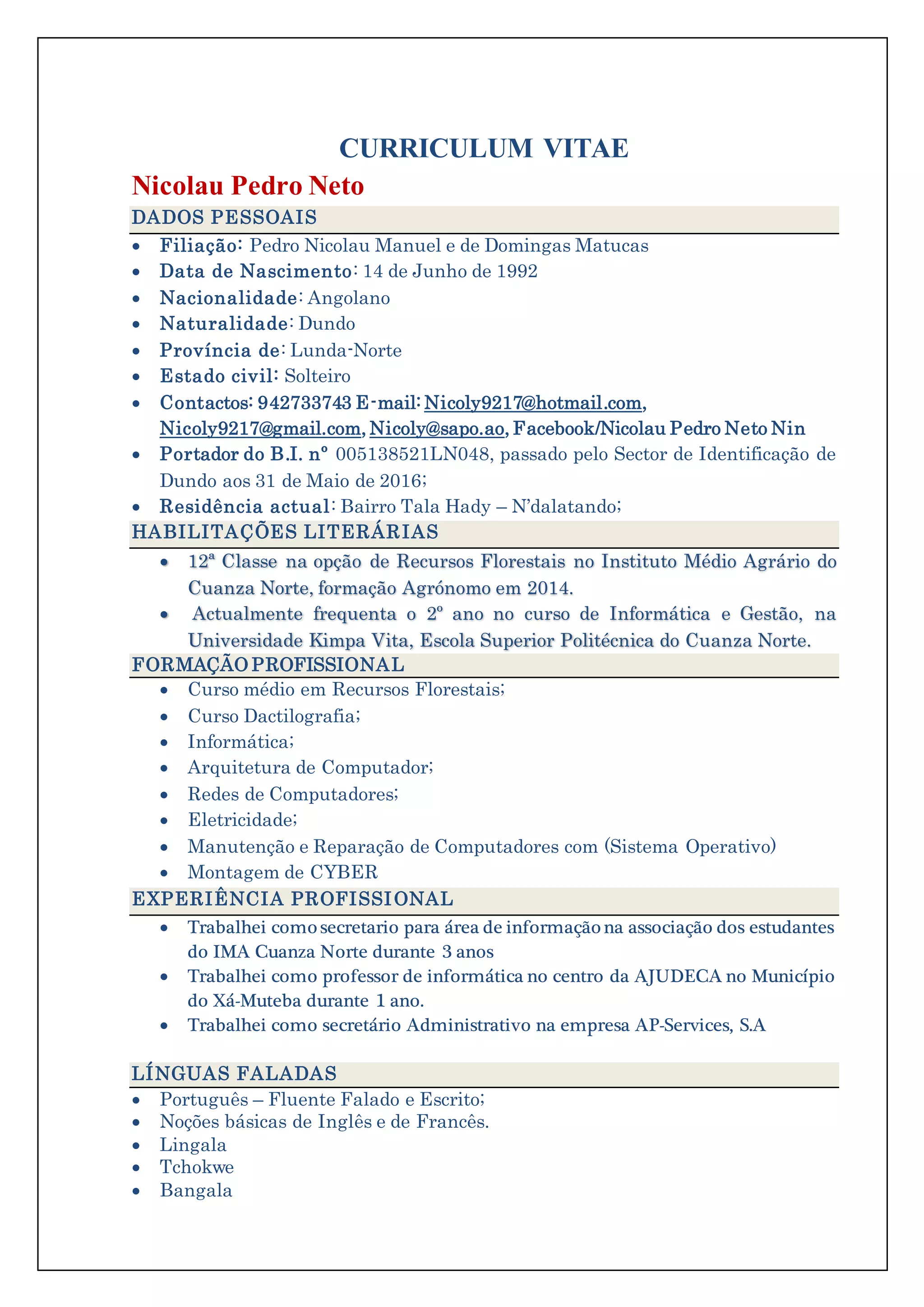 Nicolau Pedro Neto, angolano nascido em 14 de junho de 1992, possui formação técnica em recursos florestais e atualmente estuda informática e gestão. Com experiências profissionais em ensino e administração, é fluente em português e possui noções de inglês e francês. Seu objetivo é contribuir para o desenvolvimento socioeconômico do país, mantendo um bom relacionamento interpessoal.