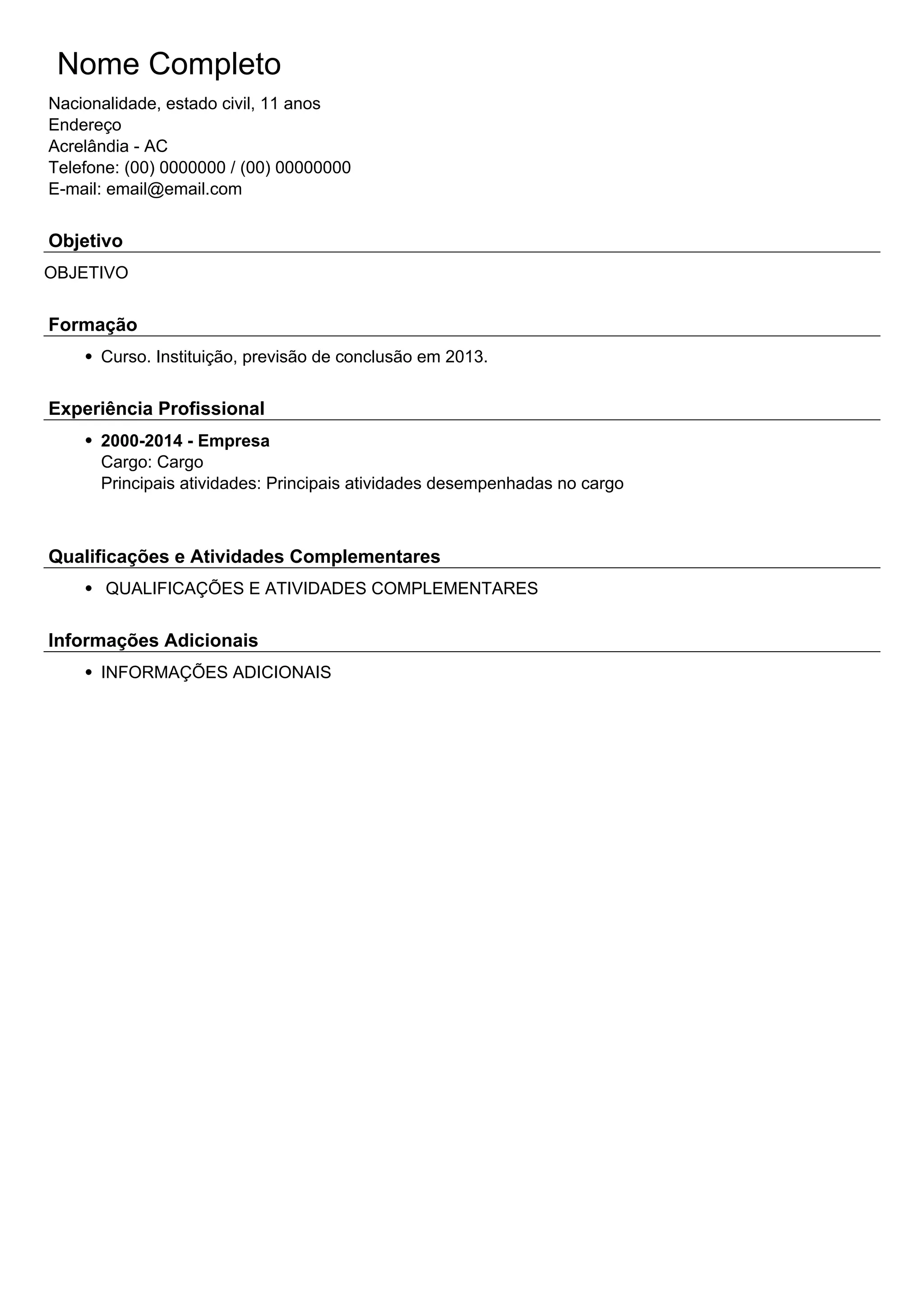 O documento apresenta um currículo com informações pessoais, incluindo nome, nacionalidade, estado civil e contato. Além disso, destaca a formação acadêmica, experiência profissional entre 2000 e 2014 e qualificações adicionais. A previsão de conclusão do curso é em 2013.