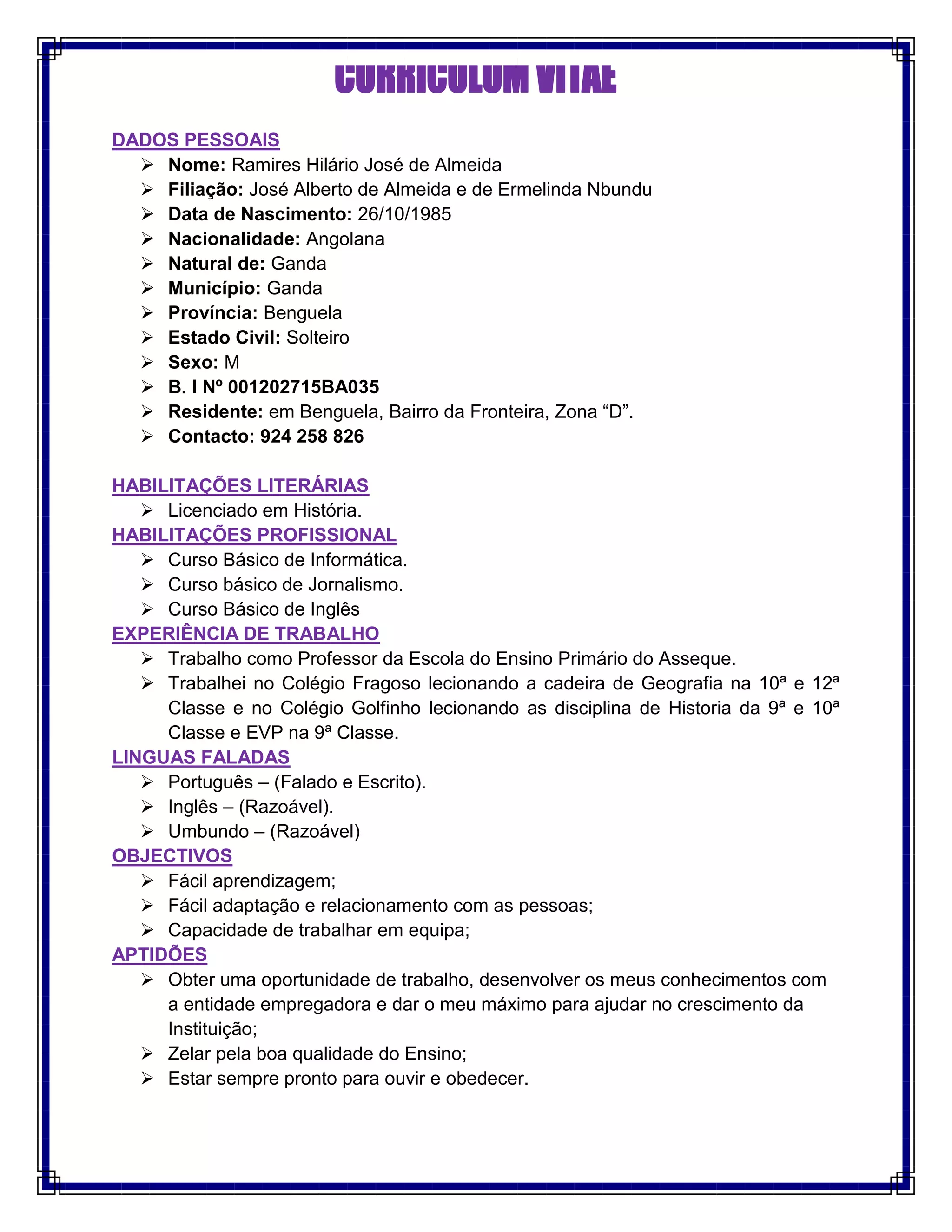 Ramires Hilário José de Almeida é um professor licenciado em História nascido em 1985 em Angola. Ele lecionou em escolas primárias e secundárias, ensinando disciplinas como Geografia, História e Educação Visual e Plástica. Seu objetivo é continuar aprendendo e se adaptando para trabalhar em equipe e ajudar as instituições a crescerem.