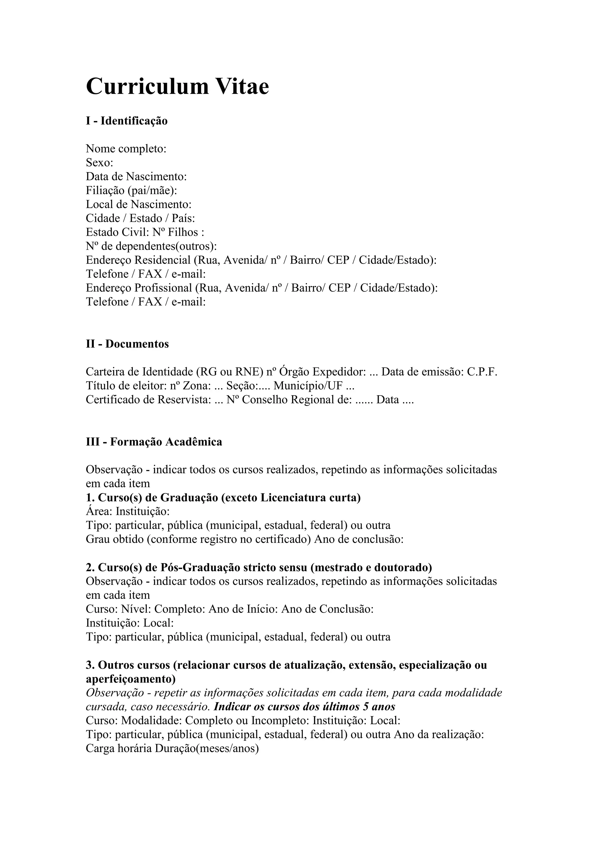 Certificado de Reservista: ... Nº Conselho Regional de: ...... Data ....