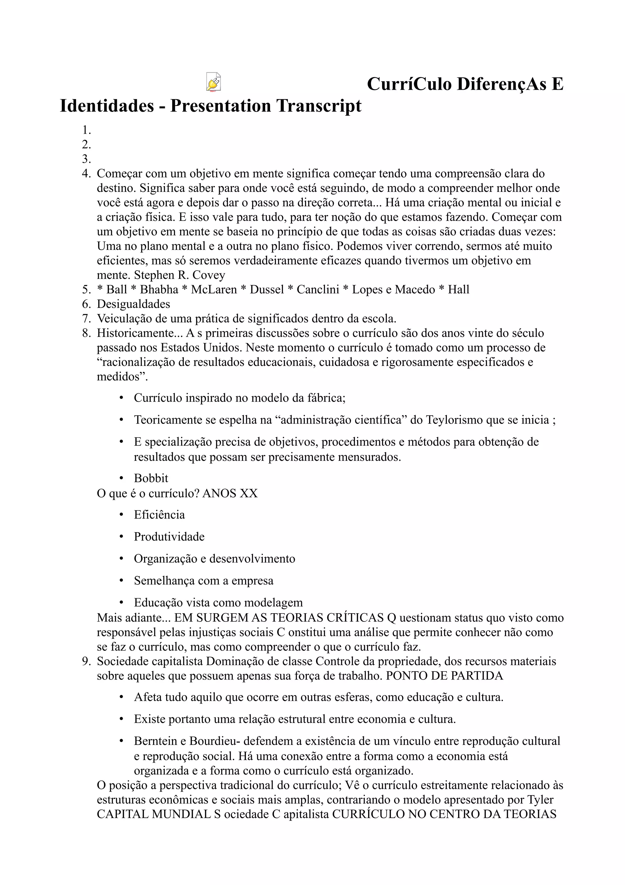 O documento discute as teorias críticas do currículo, questionando sua suposta neutralidade e objetividade. Apresenta diferentes perspectivas que veem o currículo como político e ligado aos interesses dos grupos dominantes, influenciando a construção de identidades e a reprodução das desigualdades sociais. Também reflete sobre como o currículo pode ser um espaço de resistência cultural e promoção do multiculturalismo.