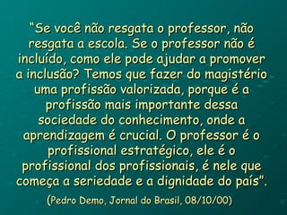 O documento defende que os professores precisam ser valorizados, pois são essenciais para promover a inclusão e o conhecimento. Sem resgatar os professores e incluí-los, as escolas não poderão ajudar a promover a inclusão. Os professores são os profissionais estratégicos e fundamentais para a seriedade e dignidade de um país.