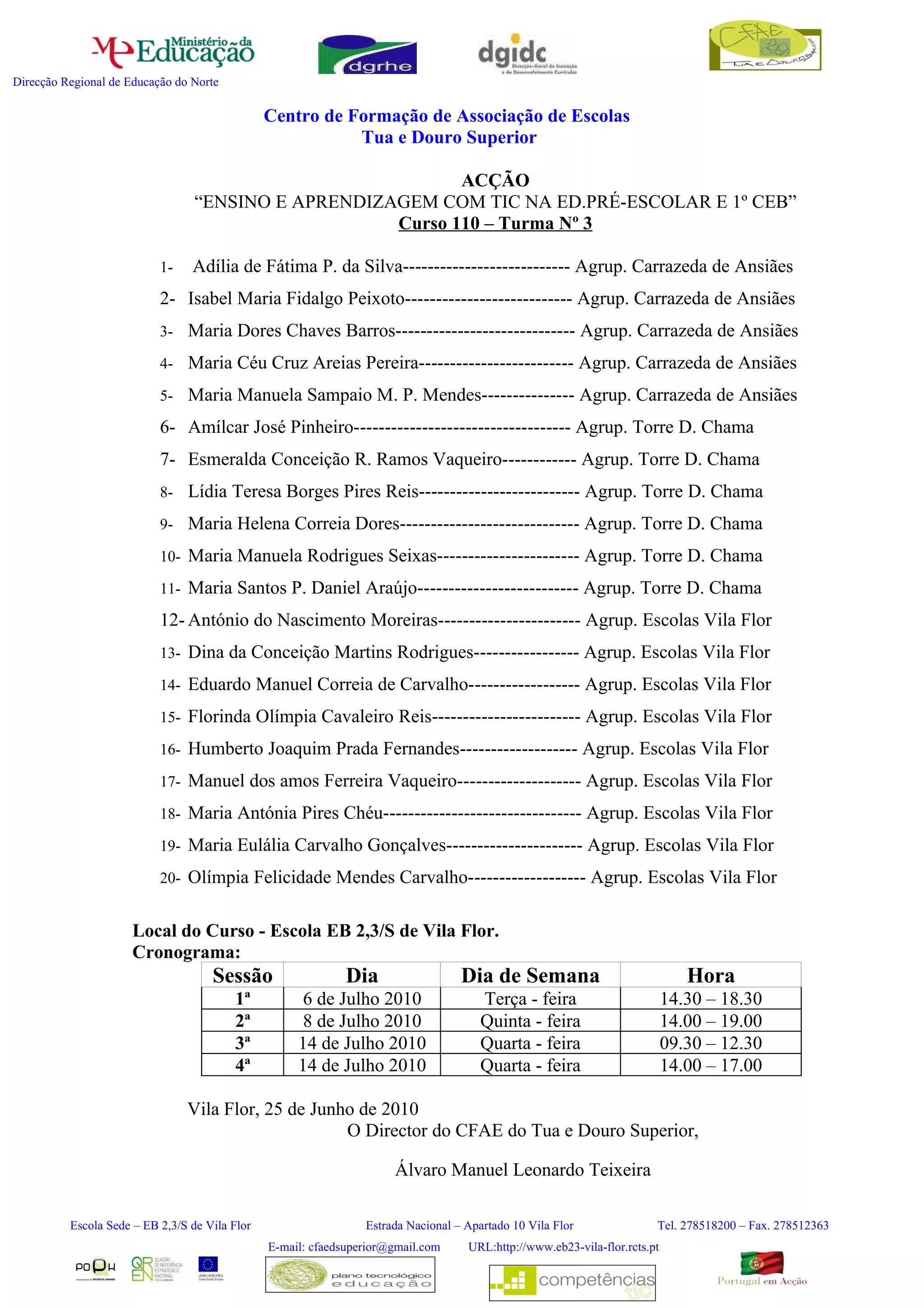 O documento lista 20 participantes de um curso sobre ensino e aprendizagem com TIC na educação pré-escolar e 1o ciclo do ensino básico. Ele também fornece o local, cronograma e diretor do curso.