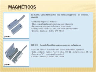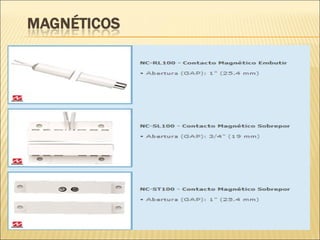 O documento discute os principais tipos de sensores e alarmes, incluindo como eles funcionam e como instalá-los corretamente. Os sensores magnéticos, de infravermelho passivo e ativo, de microondas e de quebra de vidro são explicados, assim como a função central da central de alarme. A instalação correta é importante para evitar falsos alarmes.