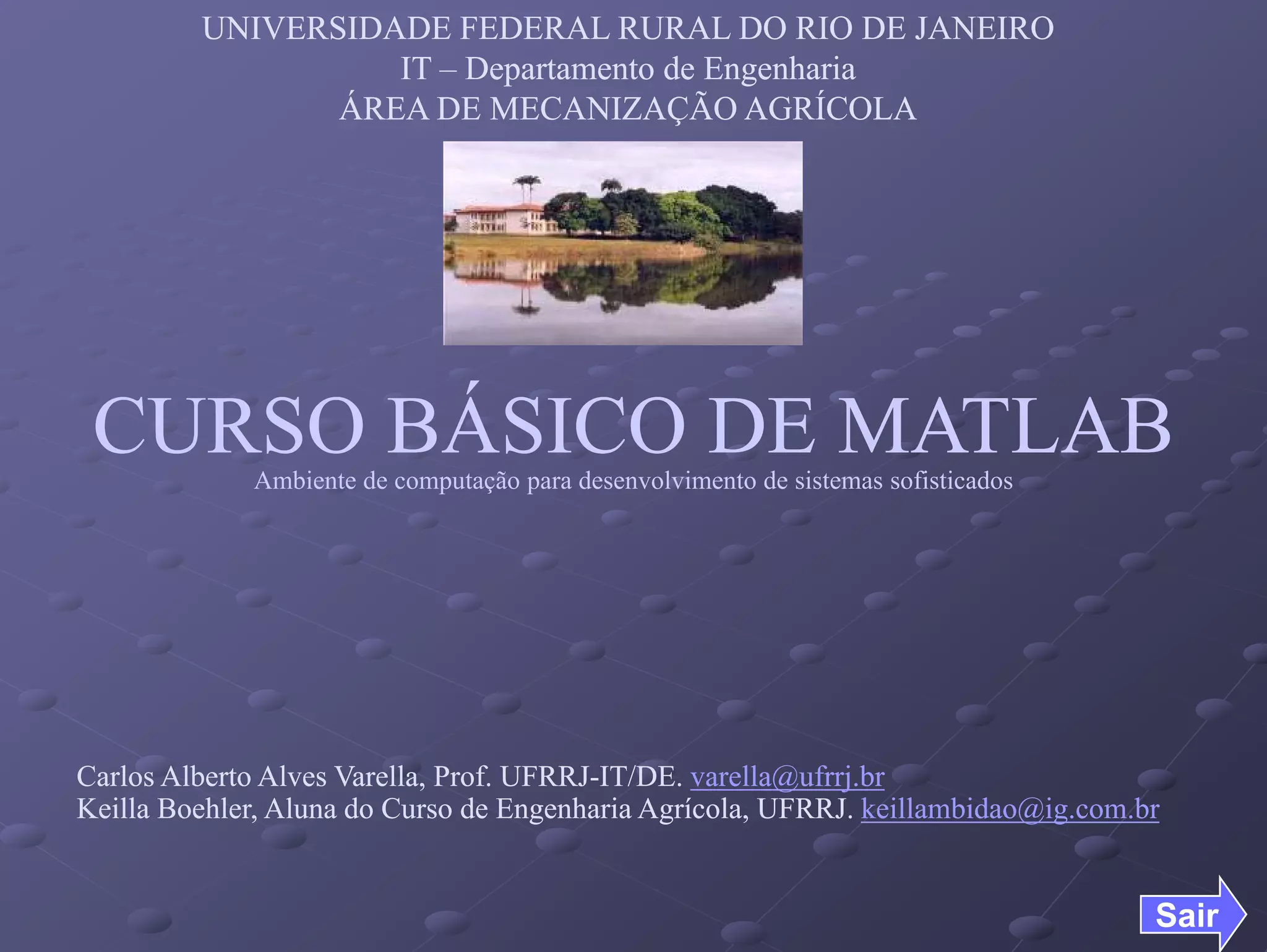 Este documento fornece uma introdução aos principais recursos e funcionalidades do programa MATLAB, incluindo: (1) MATLAB como um ambiente de computação técnico-científica para desenvolvimento de sistemas sofisticados, (2) suas principais ferramentas como janelas, manipulação de matrizes e gráficos, e (3) exemplos básicos de uso de funções matemáticas e manipulação de vetores e matrizes.