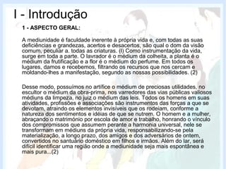 O documento apresenta uma introdução sobre a mediunidade, definindo-a como uma faculdade inerente à vida que permite servir como intermediário entre espíritos e seres humanos. Em seguida, classifica os tipos de mediunidade de acordo com sua natureza: própria, de prova ou trabalho, e de expiação. Por fim, discute a relação entre espírito, corpo e perispírito, definindo-os e explicando o papel do perispírito como envoltório fluídico que serve de elo entre o corpo físico e o espírito.