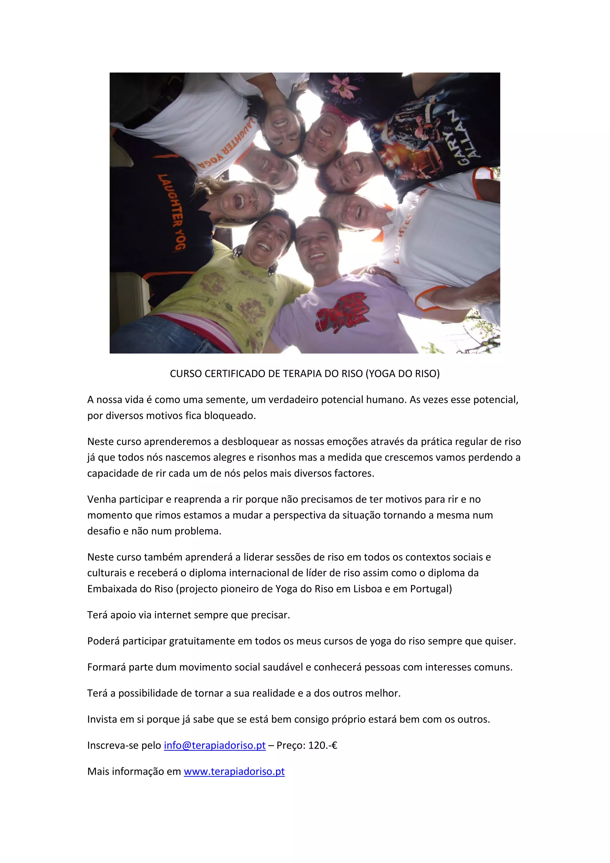 Este documento descreve um curso de Terapia do Riso (Yoga do Riso) que ensina como desbloquear emoções através da prática regular de rir. O curso ensina a liderar sessões de riso em diferentes contextos e fornece um diploma internacional de líder de riso. Ele ocorre em Lisboa durante um fim de semana e inclui sessões de riso, discussões sobre os benefícios da saúde do riso e jogos.