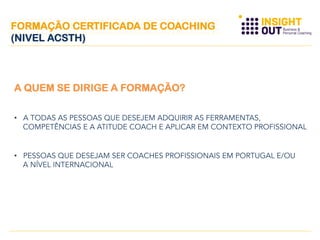 Este documento descreve uma formação certificada em coaching fornecida pela Activision e InsightOut, que é reconhecida pela International Coach Federation. A formação visa adquirir as 11 competências-chave de coaching através de uma abordagem prática e é conduzida por formadores experientes. O programa consiste em três módulos com o objetivo de capacitar os participantes a se tornarem coaches profissionais.