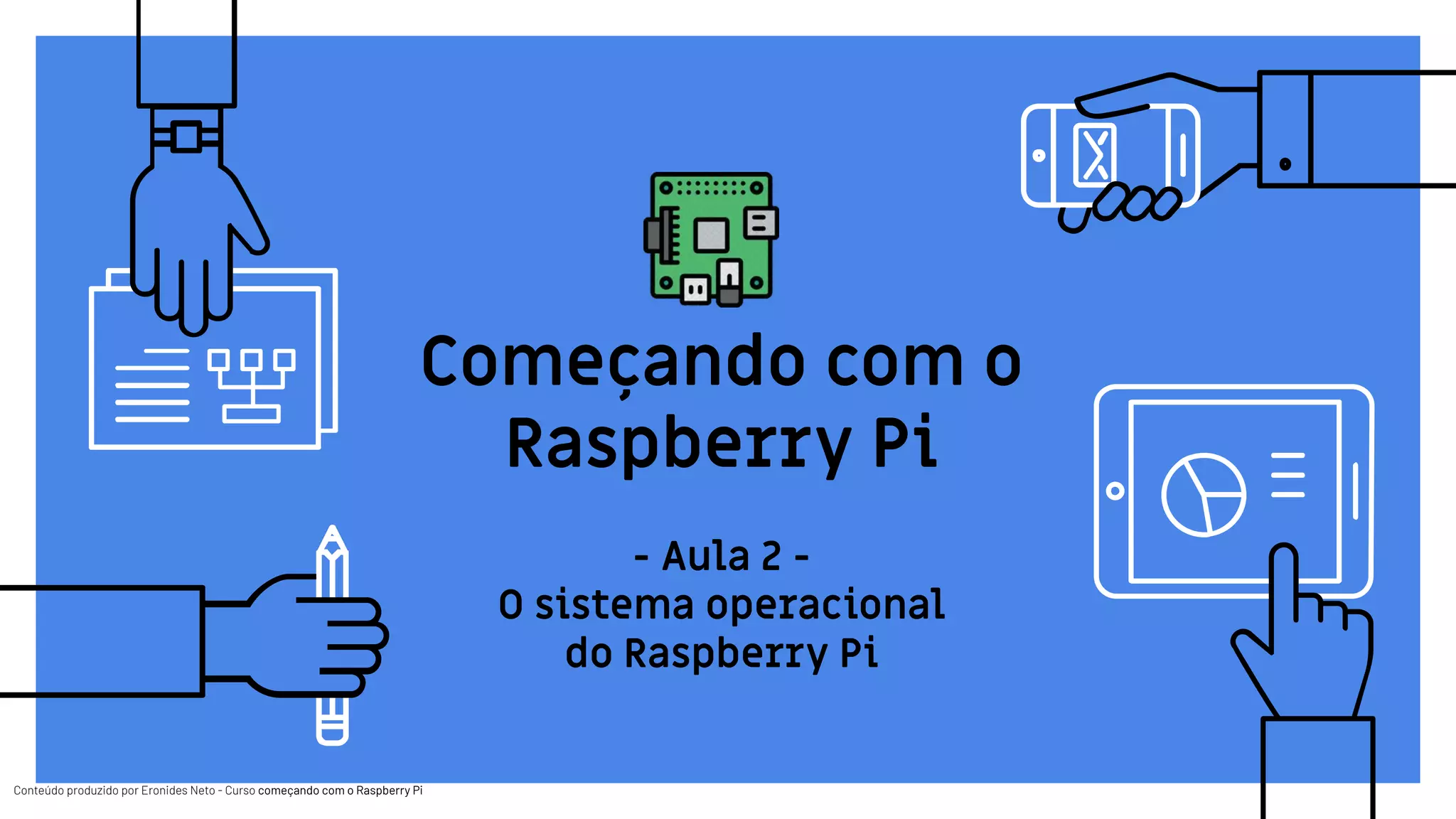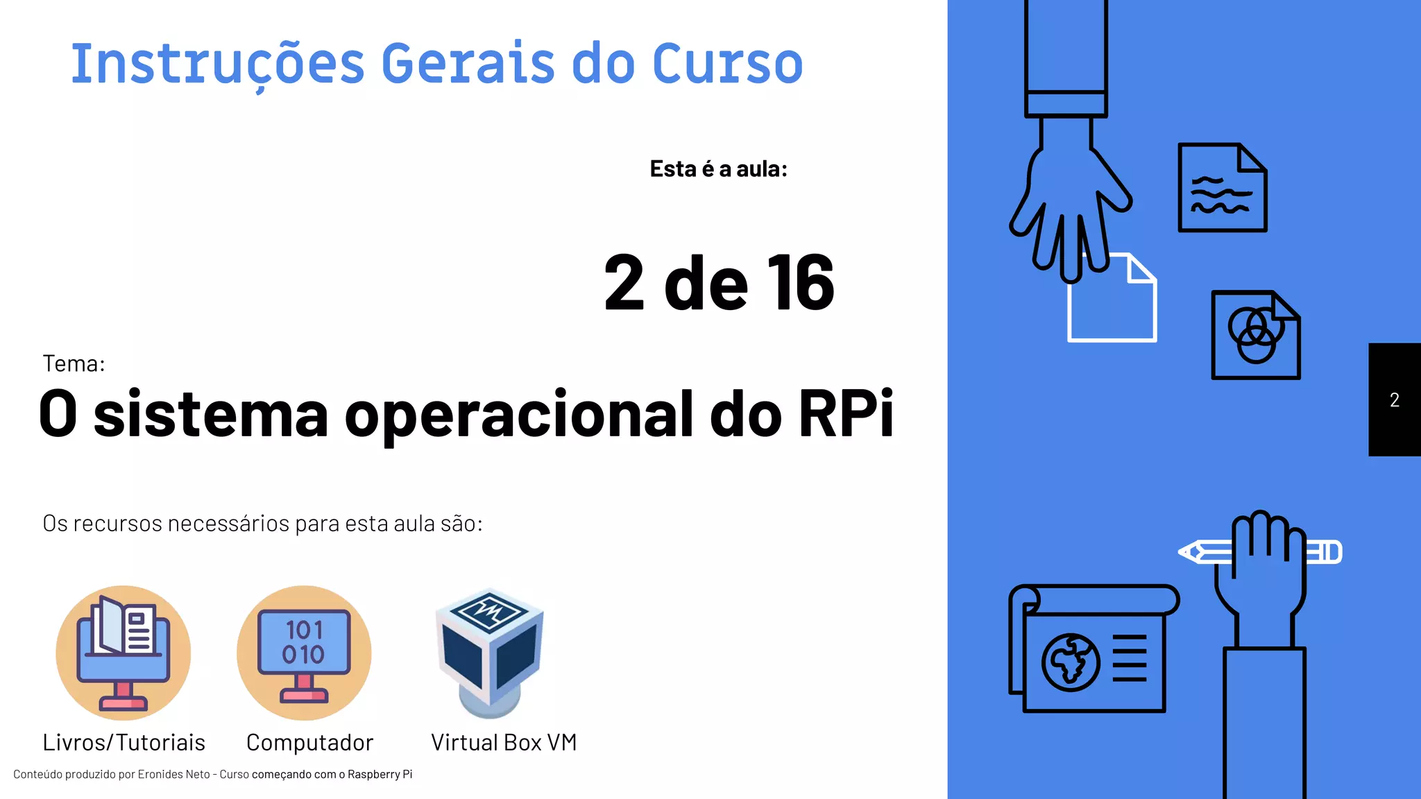 O documento apresenta o curso 'Começando com o Raspberry Pi', de Eronides Neto, focando na aula 2 que aborda o sistema operacional Raspbian e suas características. O curso é dividido em partes que incluem desde a configuração do Raspberry Pi até a programação e prototipagem, utilizando software livre. Além disso, são discutidos conceitos básicos, comandos e recomendações para aprendizado contínuo.