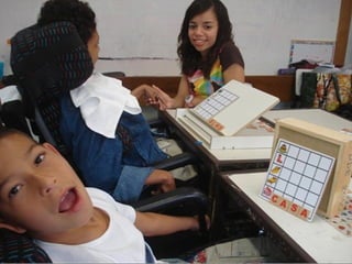 O documento discute deficiência física e intelectual no contexto escolar, fornecendo definições, tipos, implicações e estratégias de ensino. É destacada a importância de recursos adaptados e mediação para o desenvolvimento das capacidades dos alunos.