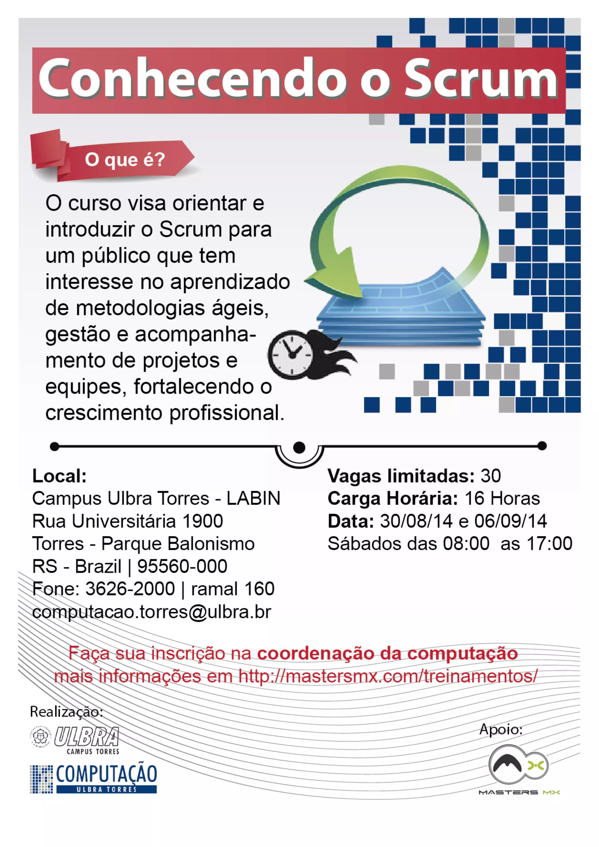 Curso de extensão de Scrum na ULBRA - Torres Vamos lá? Maiores informações e valores: http://mastersmx.com/treinamentos