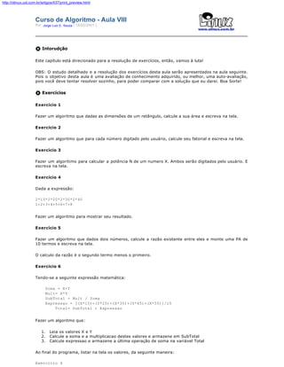 1) O documento apresenta 6 exercícios de algoritmos para serem resolvidos, incluindo cálculo de área de retângulo, fatorial, potência e expressões matemáticas.